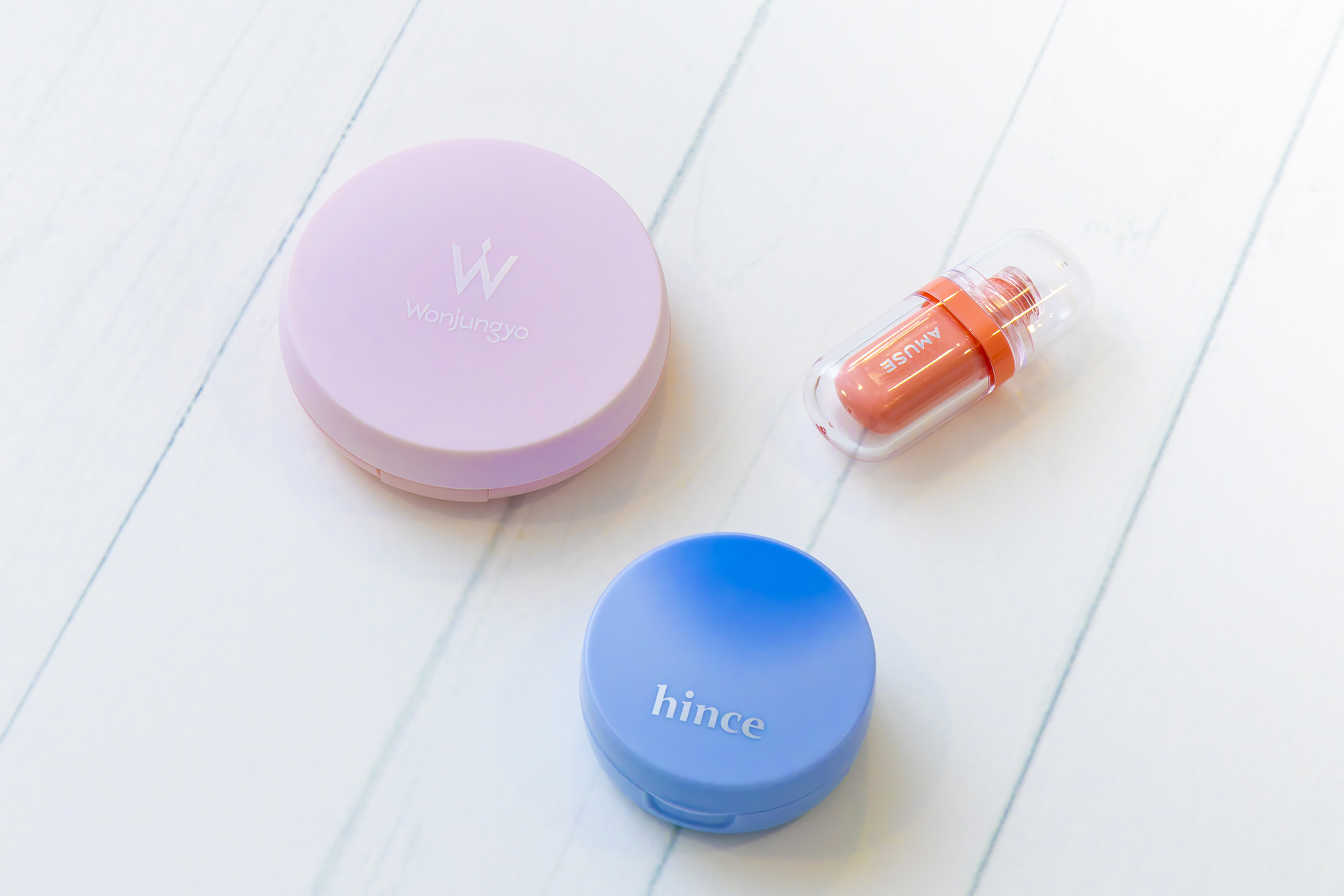 みーたかはしさんの愛用品はこちら。持ち歩くのはやはりリップのみで、AMUSE「ジェルフィット ティント」などかばんに入る小さなタイプが多いのだそう。夏は汗でメイクが崩れやすいので、プレストパウダー(フェイスパウダー)のウォンジョンヨ「エアリーフィルターパクト」を持ち歩いたり、肌荒れをしているときはhinceのクッションファンデを持ち歩くこともあるそうです。