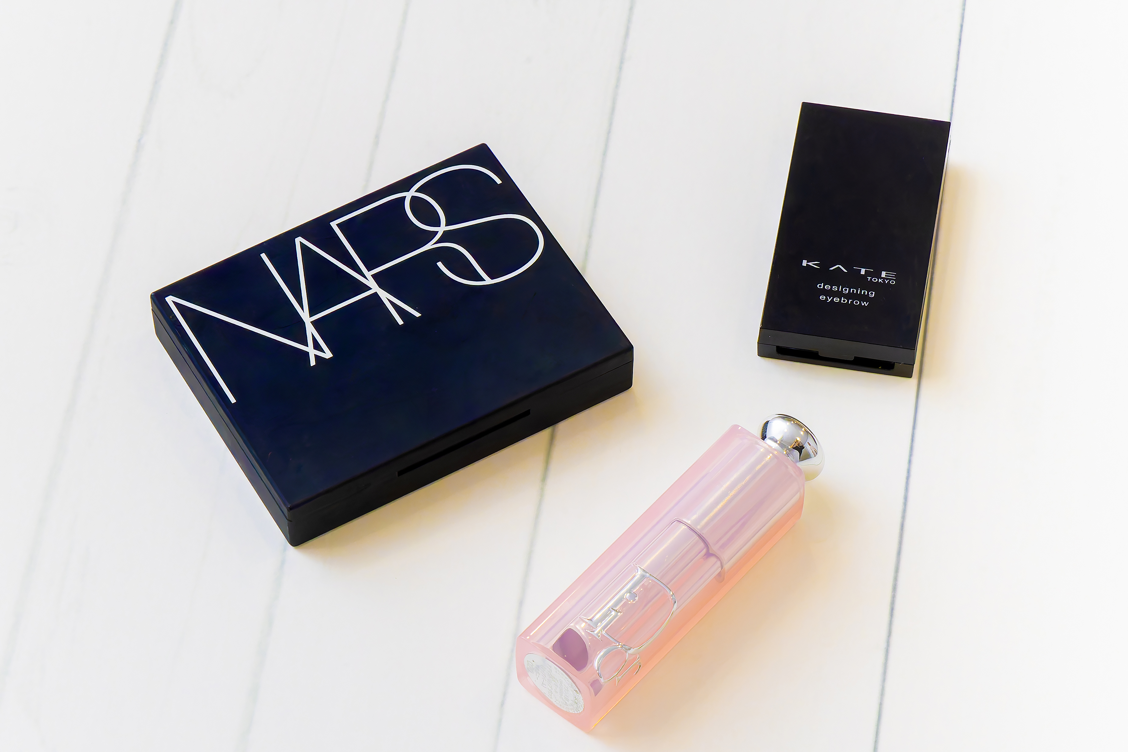 はるてぃのさんの愛用品はこちら。持ち歩くのは、リップとプレストパウダー。ベタつくのが苦手で、NARS「ライトリフレクティングセッティングパウダー プレスト N」を愛用しているそう。リップはDiorの「ディオール アディクト リップ グロウ」。小さなかばんを持ち歩くのが好きなこともあり、コスメを購入する時はなるべくコンパクトなものを選んでいるそうです。
