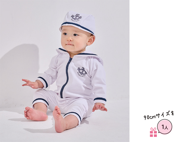 赤ちゃんから2~3歳まで使える、キャップ付き水着。UVカット率99%以上+保温機能付きで、つなぎタイプだからお着替えもスムーズ。90cm、1万1000円。