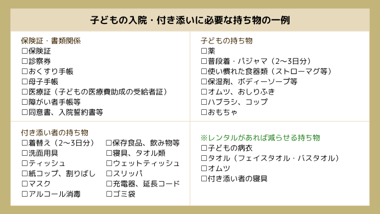 子どもの年齢や病状、病院の環境によって異なりますが、事前に情報収集して持っていく物を整理し、院内のレンタル品なども上手く活用すれば少しでも身軽に快適に過ごすことができます。