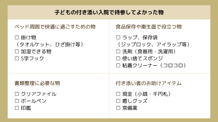 初めての入院付き添いでは「とりあえず全部持っていこう」と荷物が増えすぎてしまいましたが、実際に使わなかったものも多くありました。