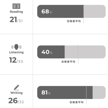 リスニングが全然できなかったので落ちたと思いました。ですが、合格基準スコアより少しプラスで合格!びっくりです。英検2級合格のコツは、ライティングを必死でやること。久しぶりに英語に触れる私たちができる最短コースはこれだと思います。