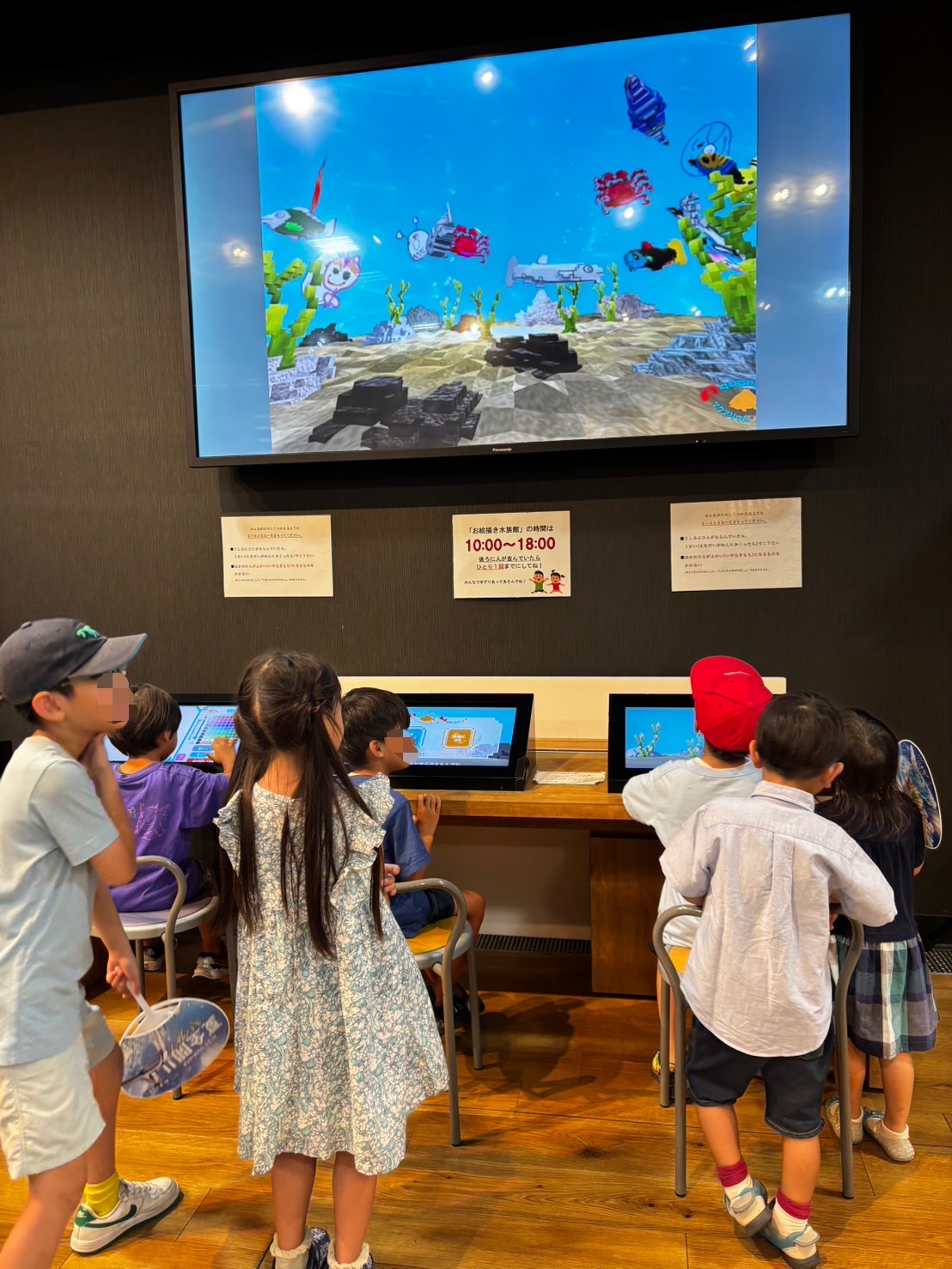 子ども達に大人気だったのが、自分で考えたり色付けした絵が、大画面にがれるコーナーです。