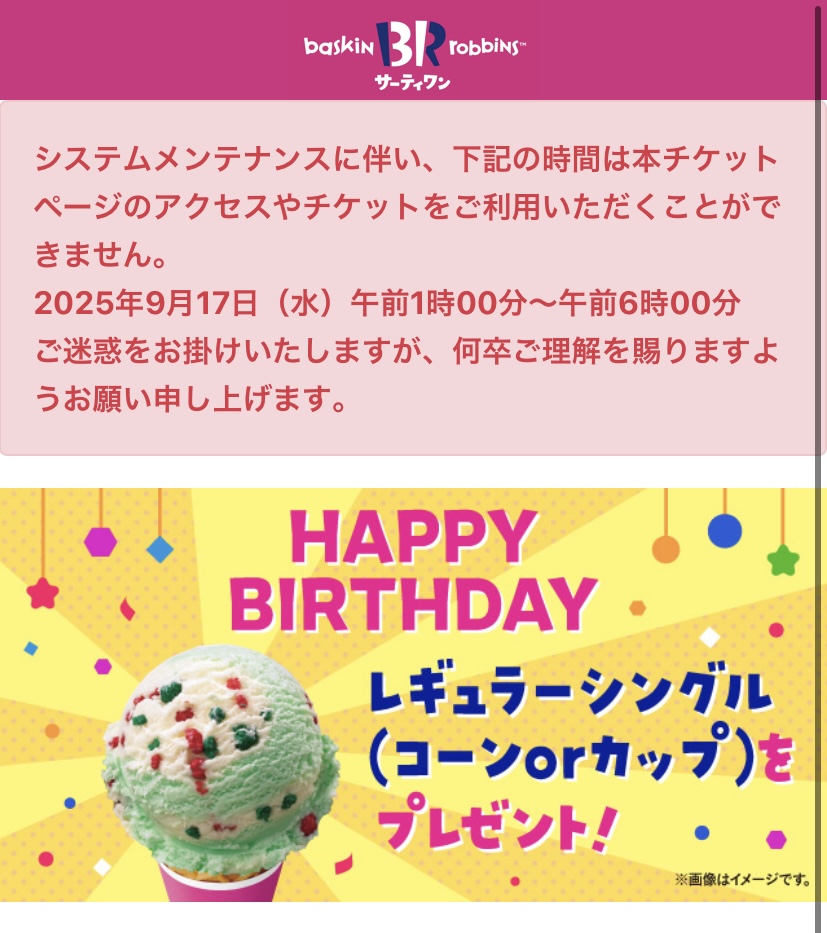 サーティワンでは、会員アプリ「31Club」に登録すると誕生日月にレギュラーシングル(コーンorカップ)1個無料クーポンが届きます。