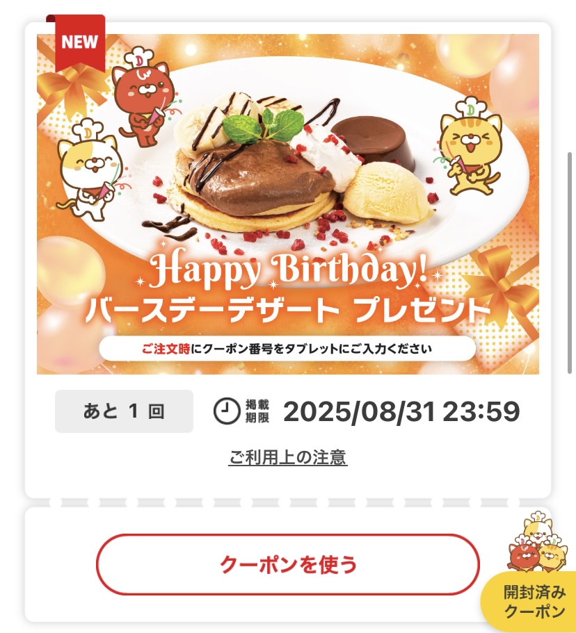 さらに嬉しいのが、同時にもらえる合計金額20%オフのバースデークーポン。これを併用すると、食事代も割引されて、デザートは無料。実際に使ってみると「ここまでお得でいいの?」と思うほど大満足でした。