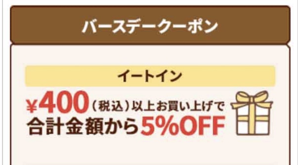 ミスドからも、誕生日月に「400円以上購入で合計金額から5%オフ」クーポンが届きました。イートイン・テイクアウトどちらでも利用できるのが便利。