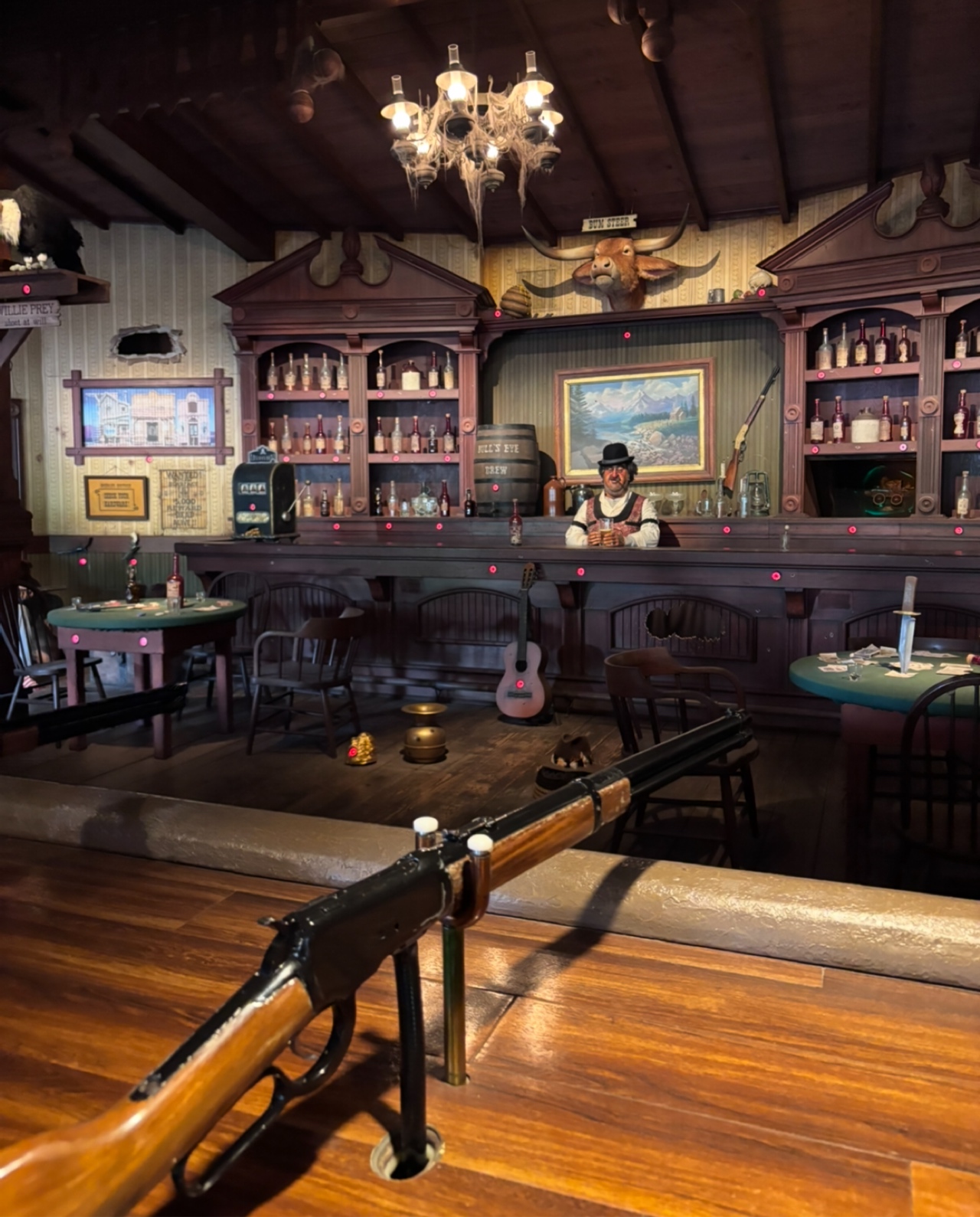 カウンターに並んでいるウインチェスター・ライフルを使って、赤く光る的を狙って撃つ体験型のアトラクション!