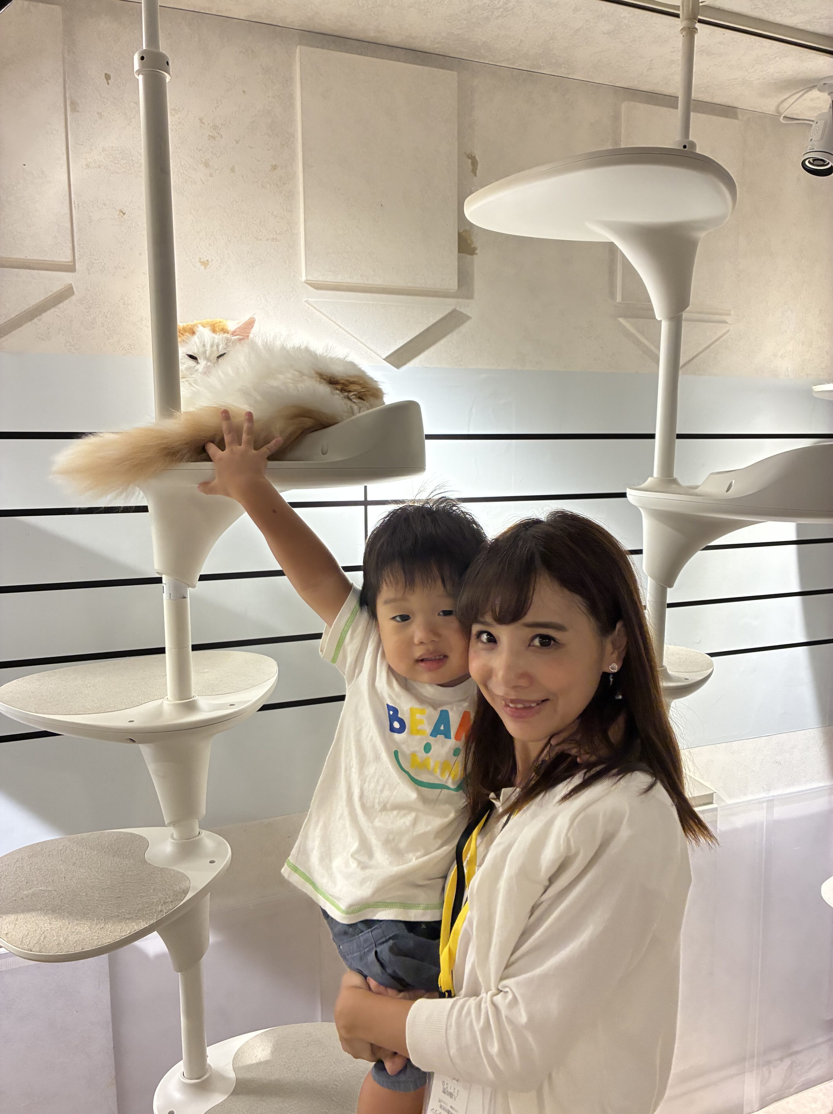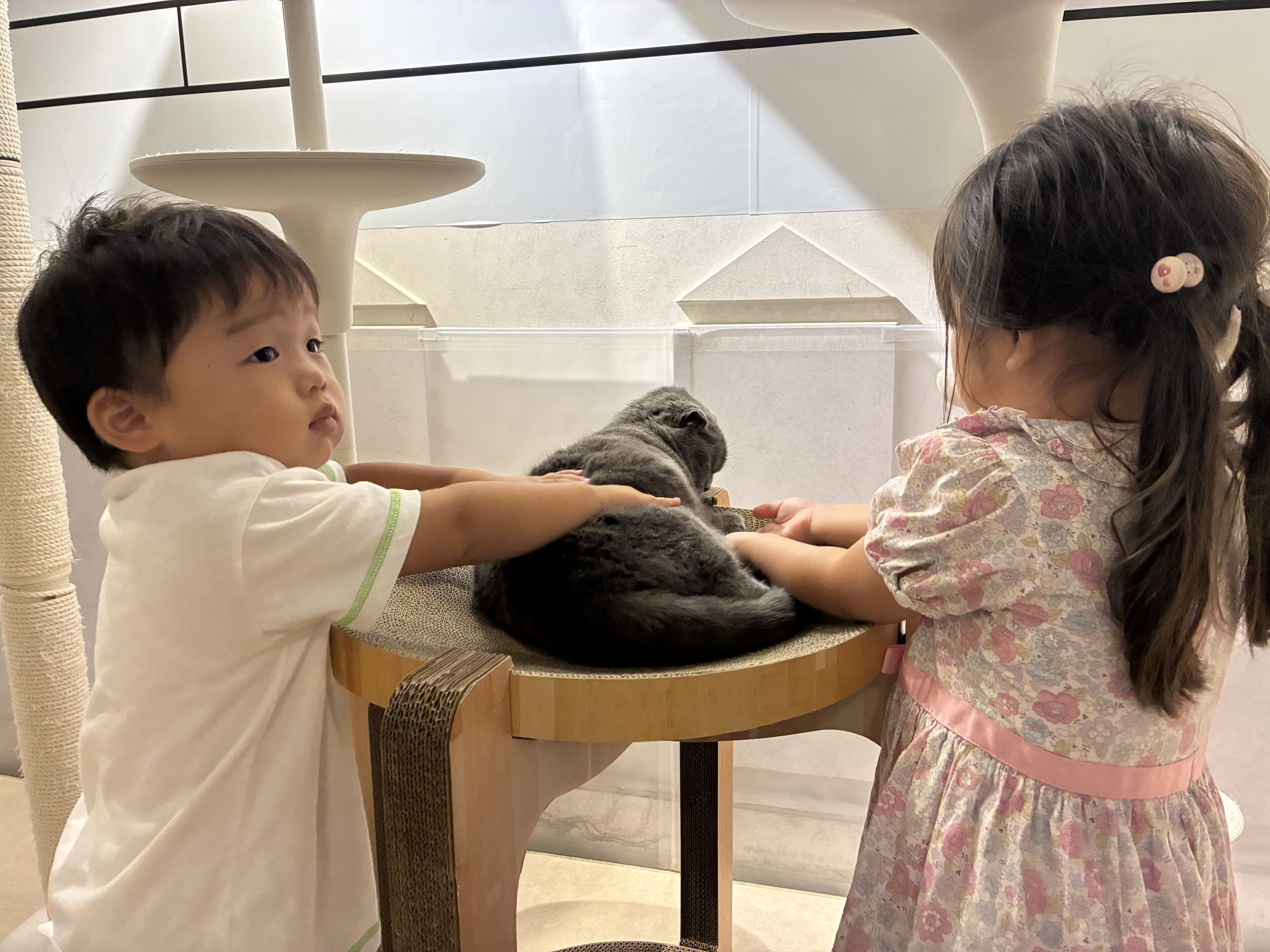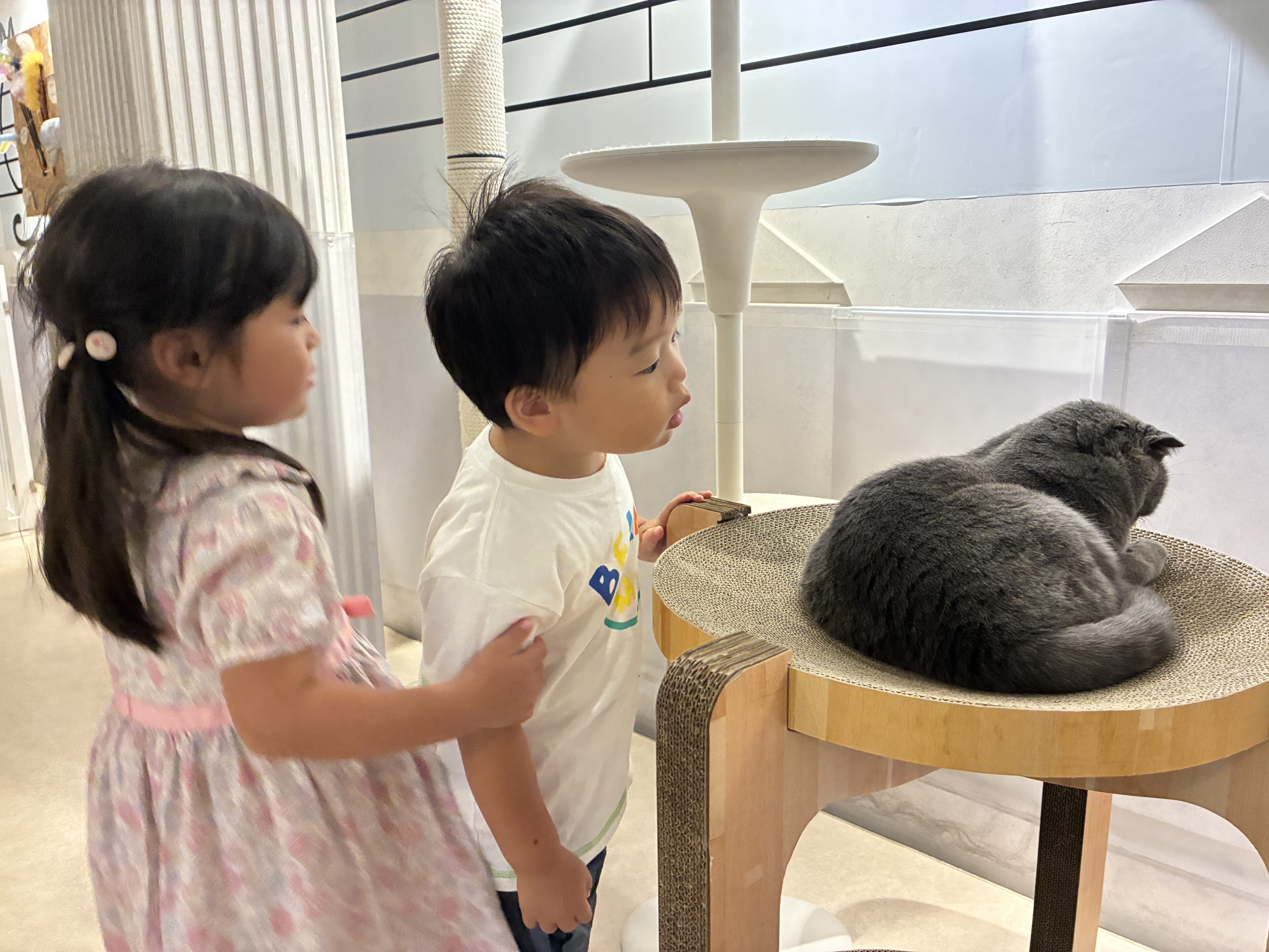 子供達は本物の猫ちゃんと遊ぶのを楽しみにしていたのですが、猫の性格上気まぐれなことが多く、キャットタワーから降りてきてくれずあまり触れ合うことができませんでした。泣