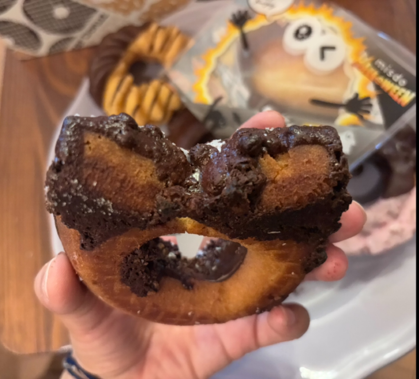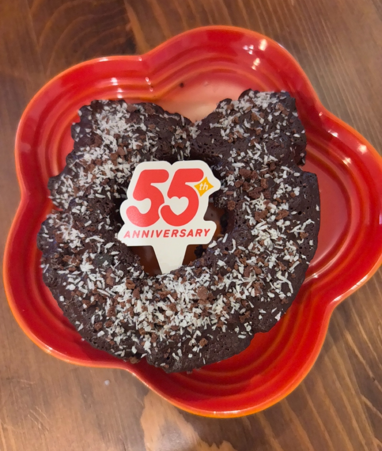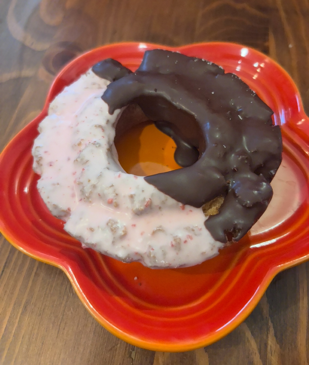 このドーナツは、チョコ&ストロベリーのハーフ&ハーフなんです!