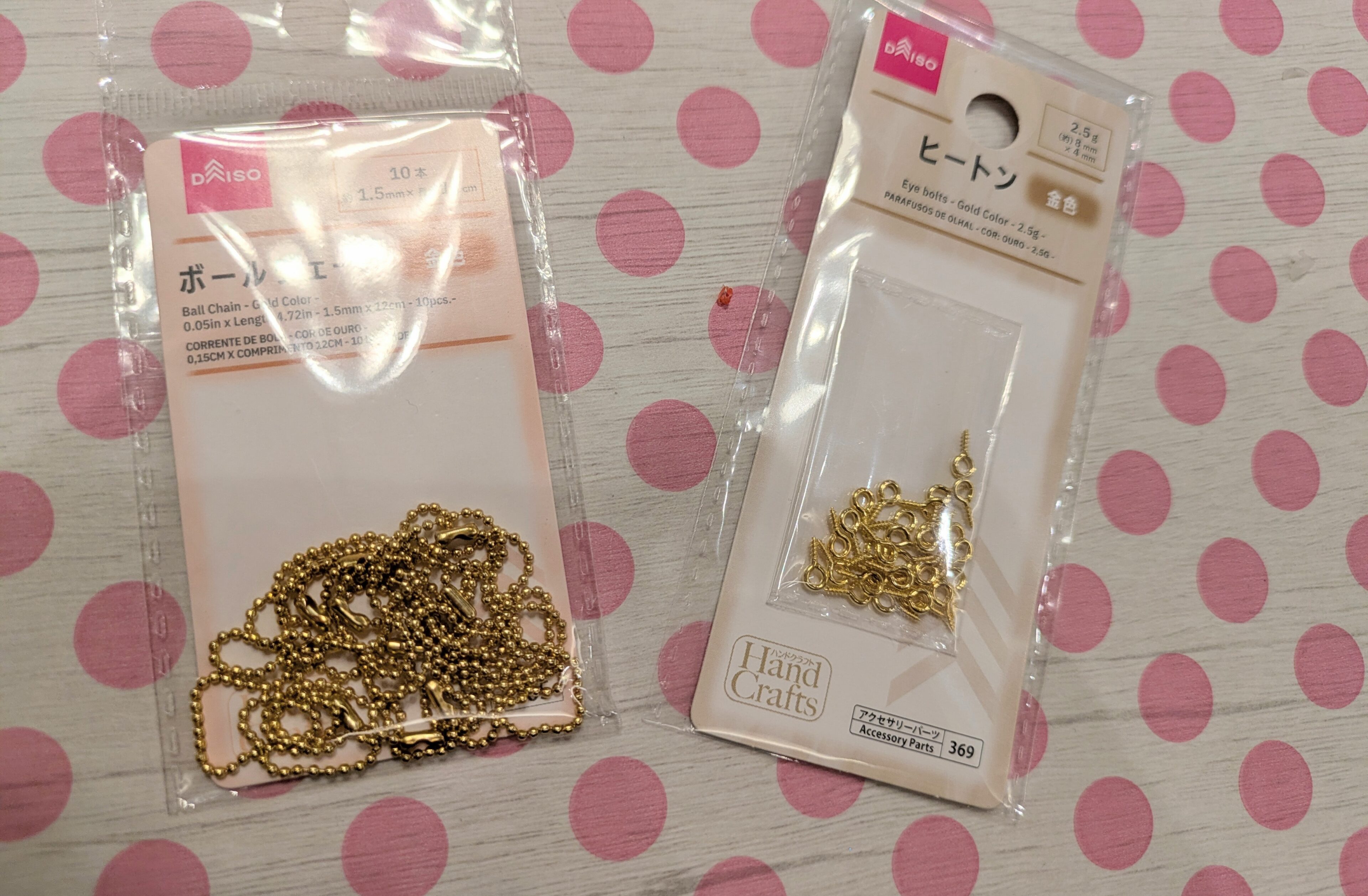 お好みの位置にニッパーでヒートンを取り付け、ボールチェーンをつけたら出来上がり!