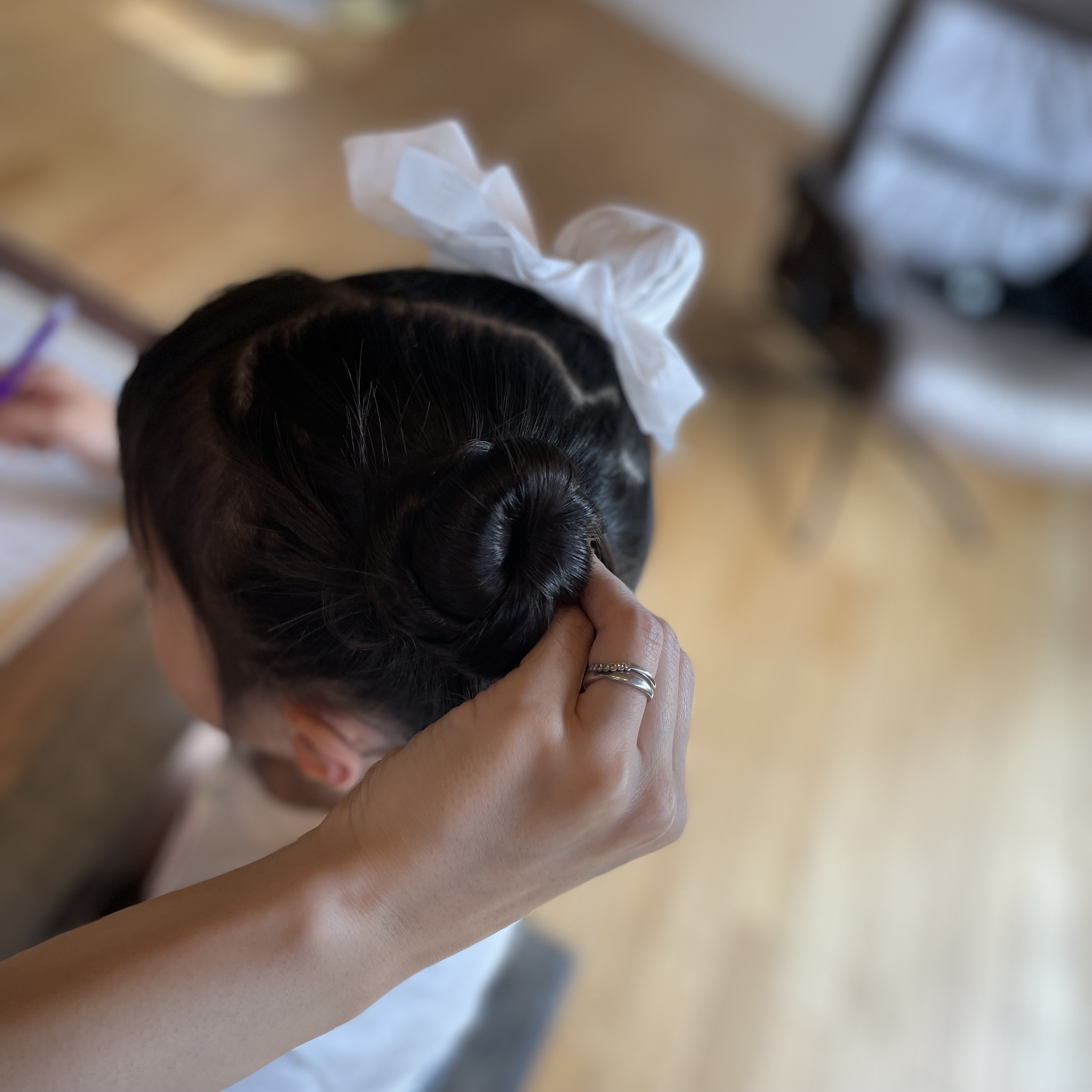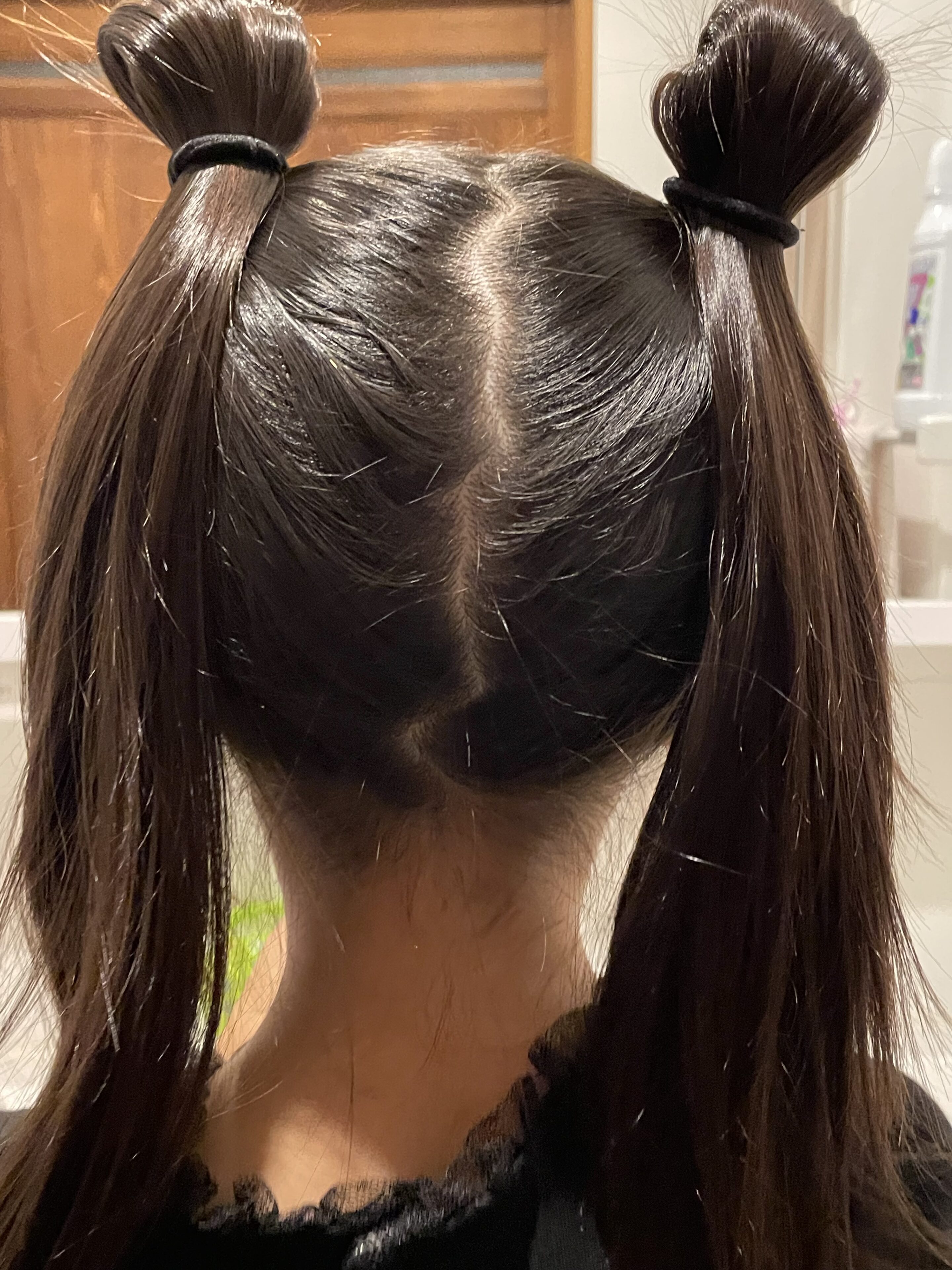 サラサラでまとめにくい髪の毛のお子様は、三つ編みにしてからお団子にすると作りやすかも!