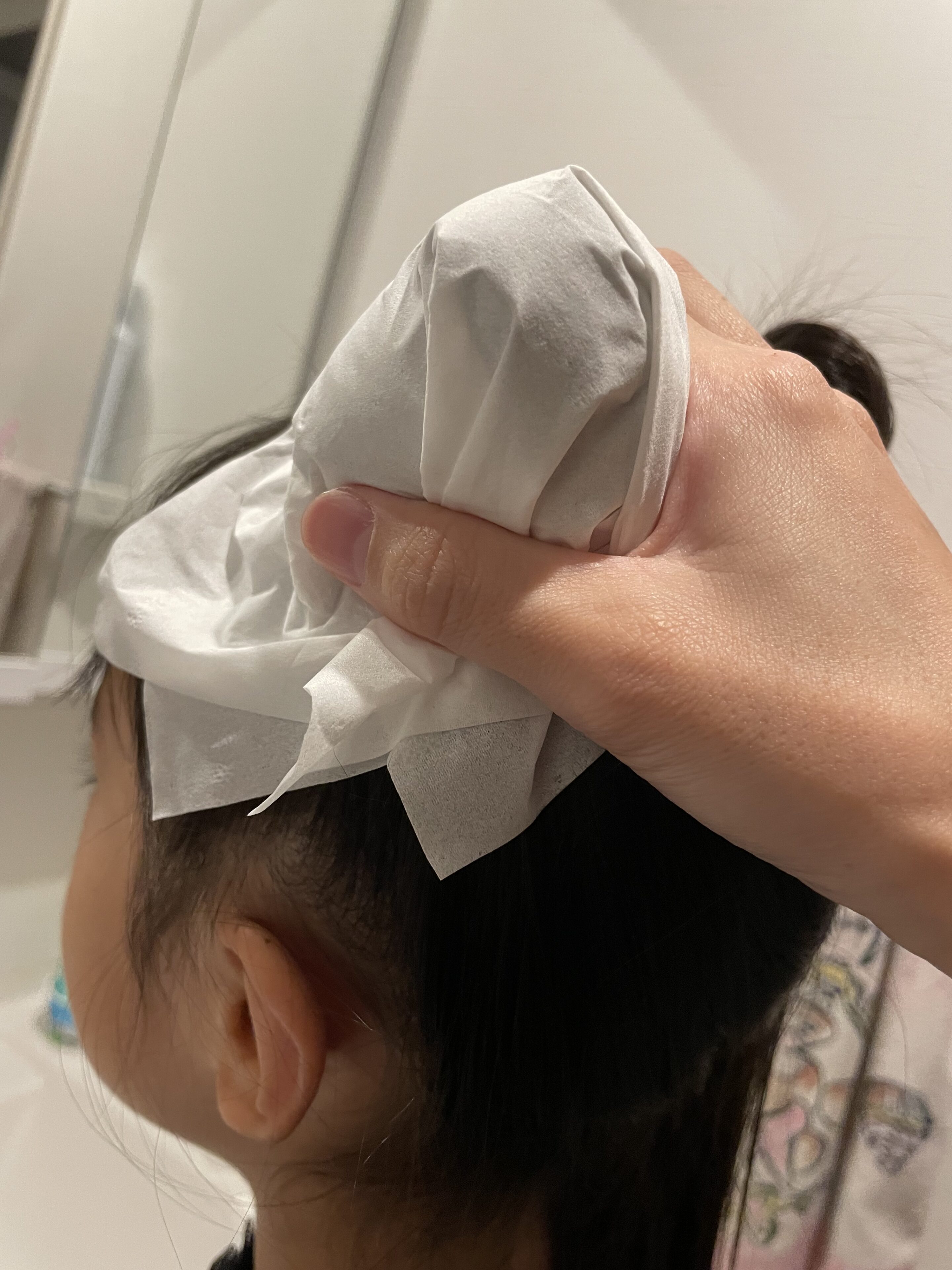 髪の毛が少ないお子様は、余ったティッシュを切るとバランス良く仕上がります。