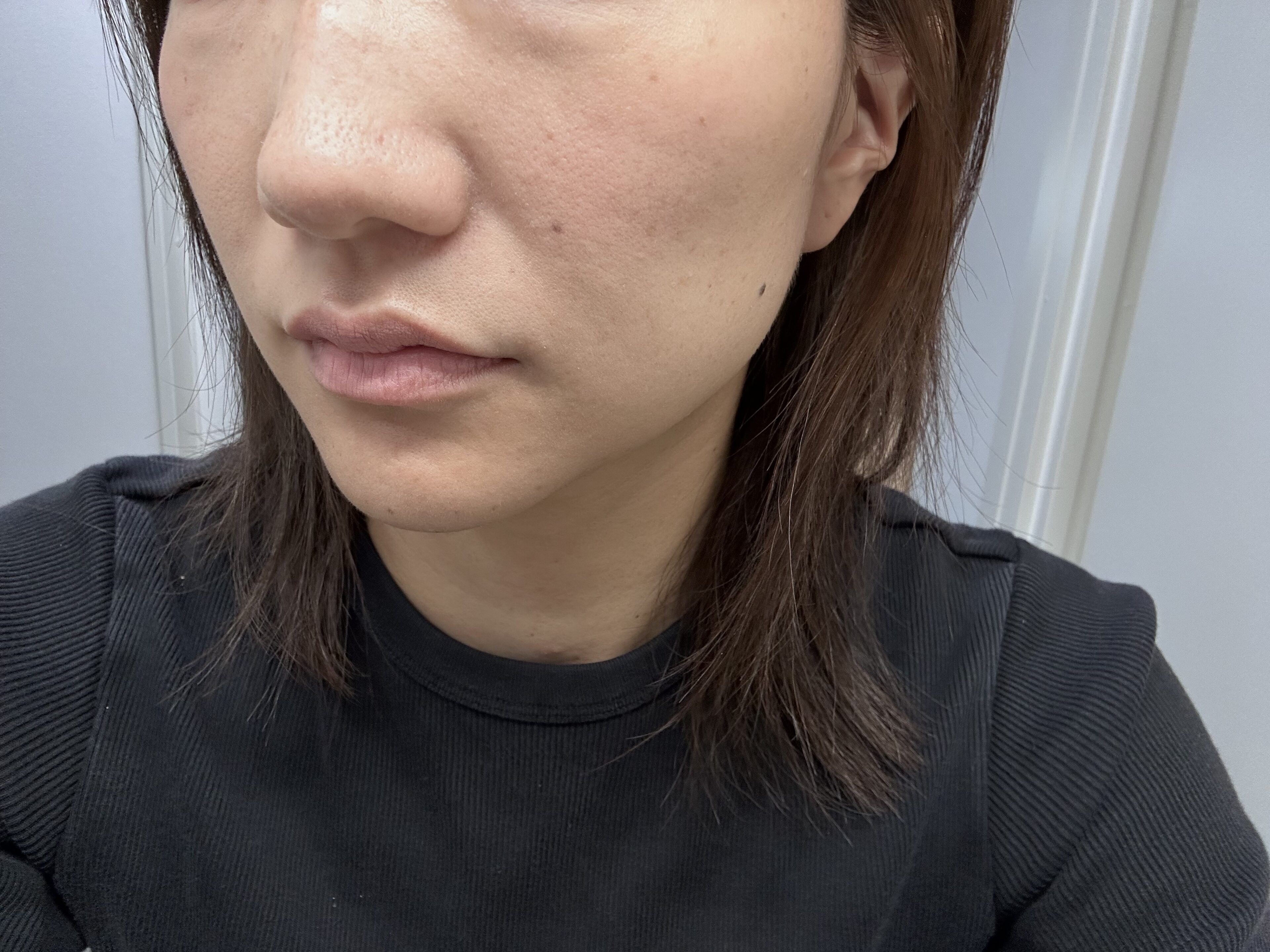 下地とファンデーションのみで仕上げた顔は顔色も悪く、なんとなくのっぺりした印象に。