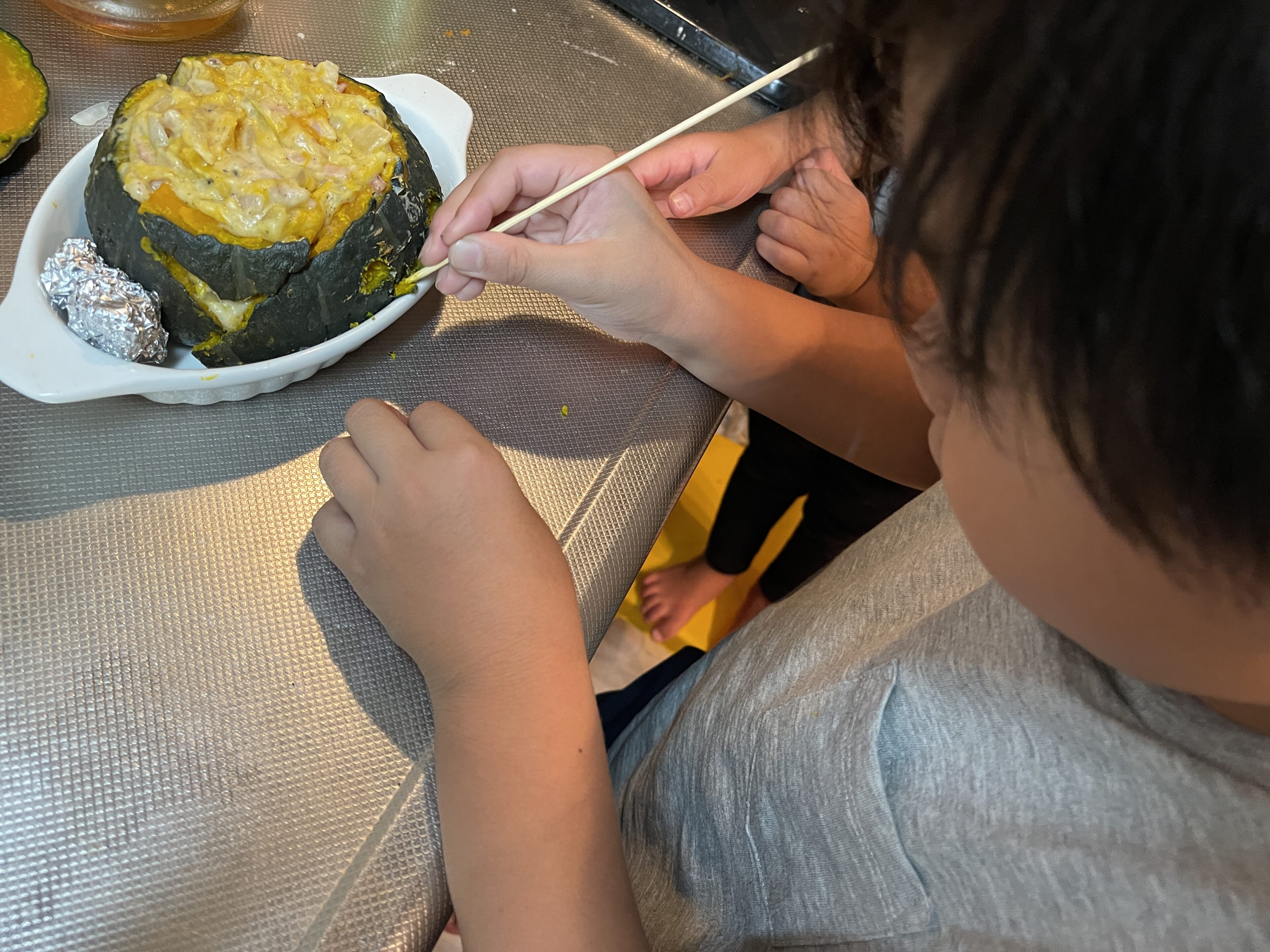 (6)とろみがついてきたら、フライパンの中に(2)でくり抜いたかぼちゃを入れ、混ぜます。少し粗目につぶした方が触感が残って美味しいかも!