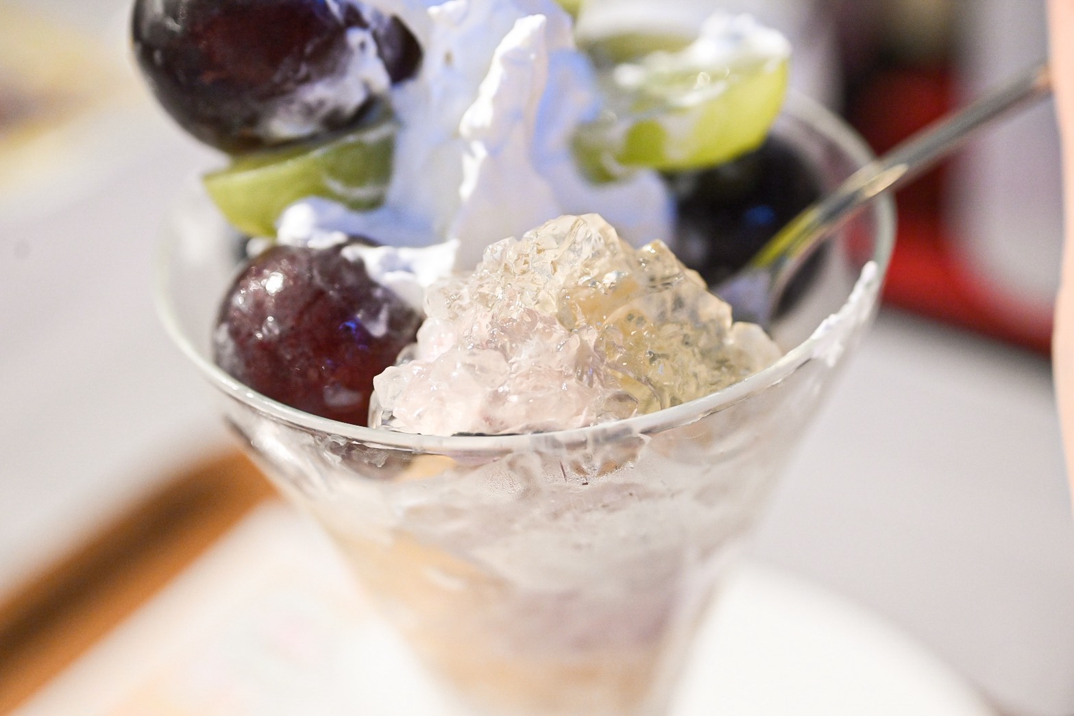 ぶどうの砂糖漬け、ココナッツゼリー、ぶどうゼリー、ピオーネアイス、バニラアイス、ポッキー、生クリーム入り