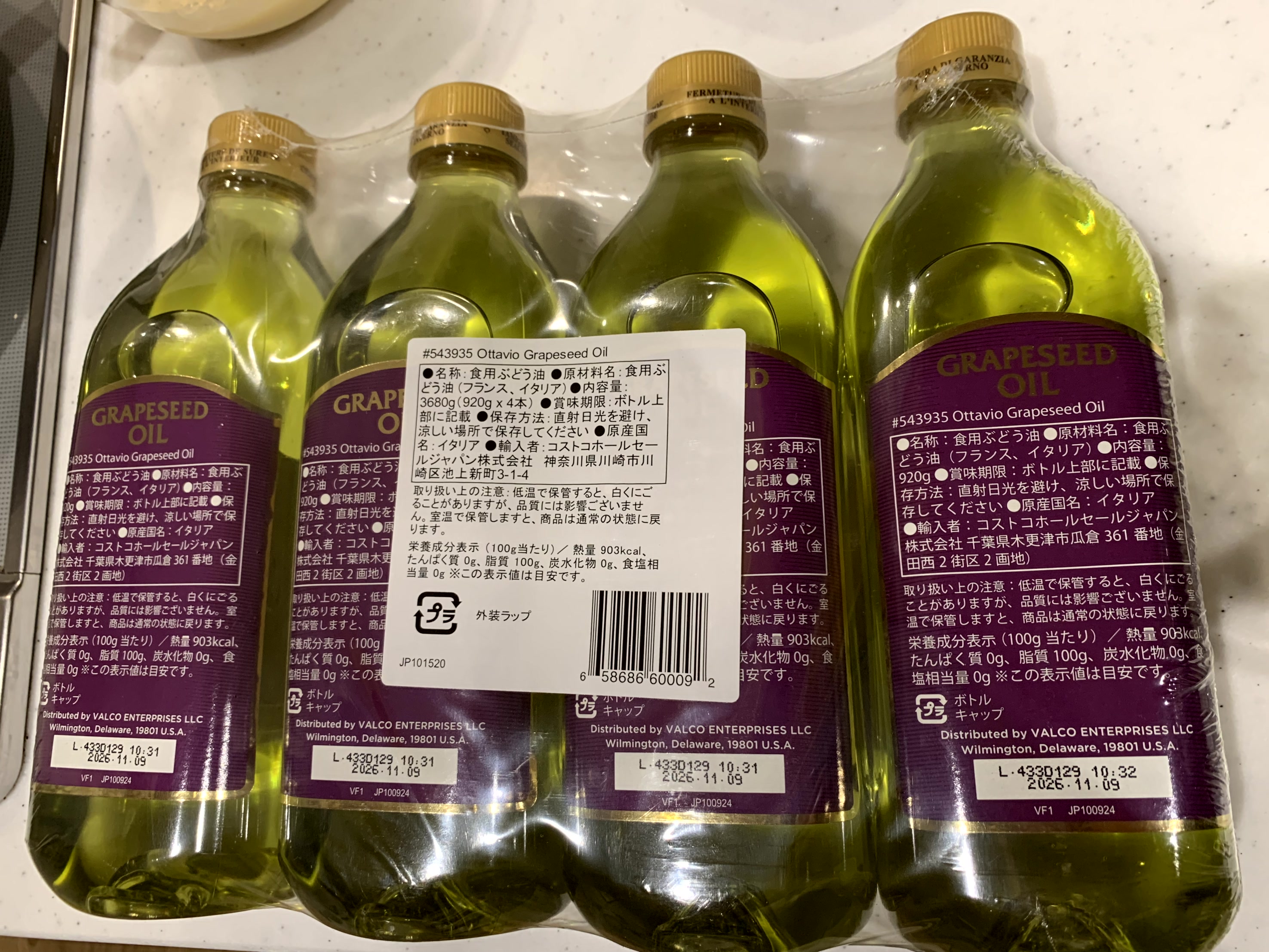 グレープシードオイル、我が家では初コストコでオリーブオイルを探していた際にあまりにオリーブオイルが高額で、「これに代わって使えそうなオイルってあるのかな?」と夫が疑問に思ったことがきっかけでした。私はその場におらず子どもたちと一緒にお菓子コーナーを散策していたので、夫が1人で見つけてきました。