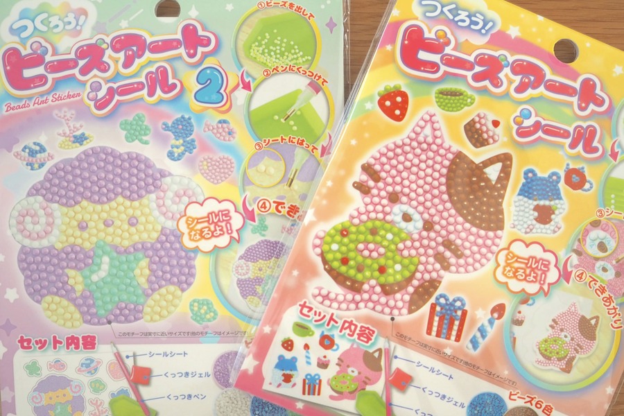 ふと立ち寄った100均のおもちゃコーナーで見つけた「つくろう!ビーズアートシール(各110円)」。