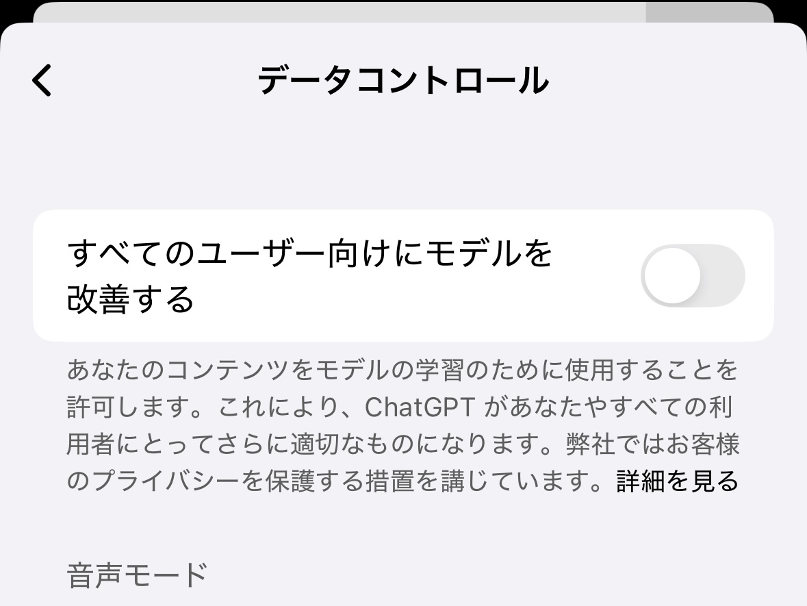 → 設定→「データコントロール」→「チャット履歴とトレーニング」または「すべてのユーザー向けにモデルを改善する」をオフ