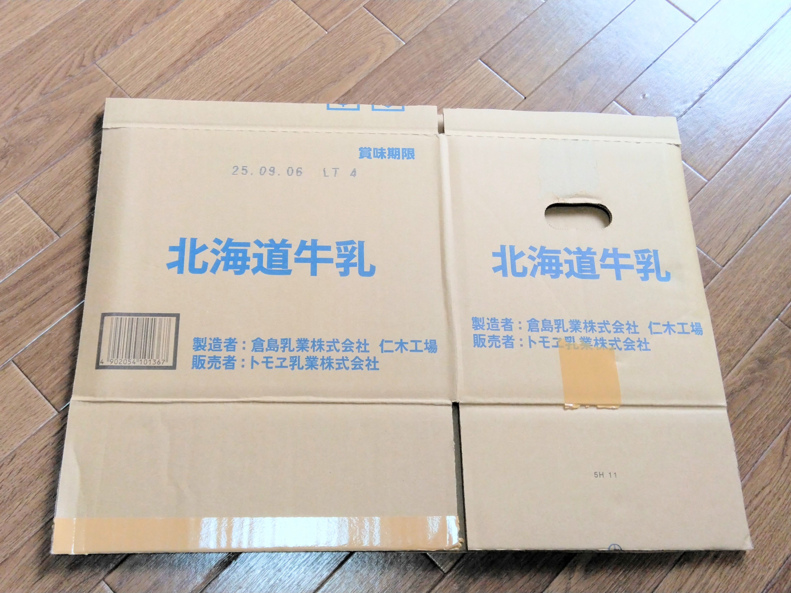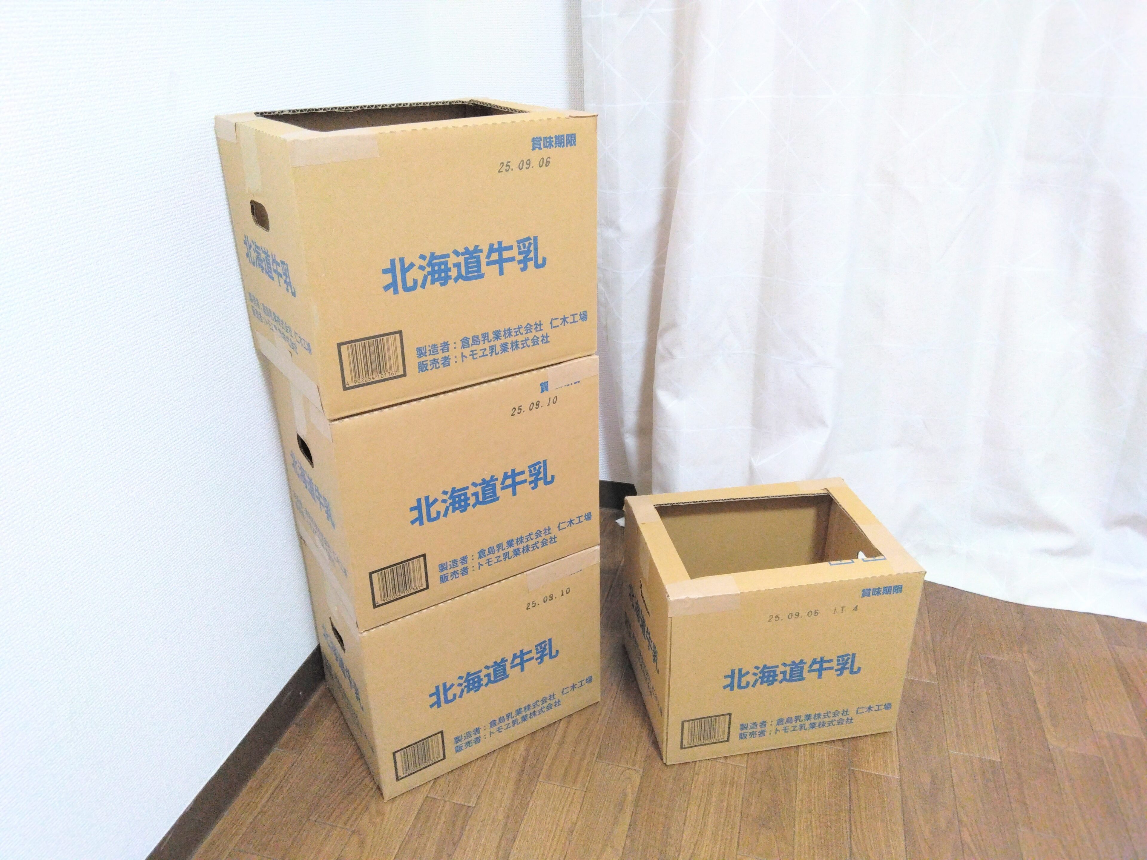 自宅にある空き箱でも良いのですが、重ねて使う場合はサイズを統一することがとても大切。私の体感では、スーパーよりもドラッグストアのほうが「同じ段ボール」があります。