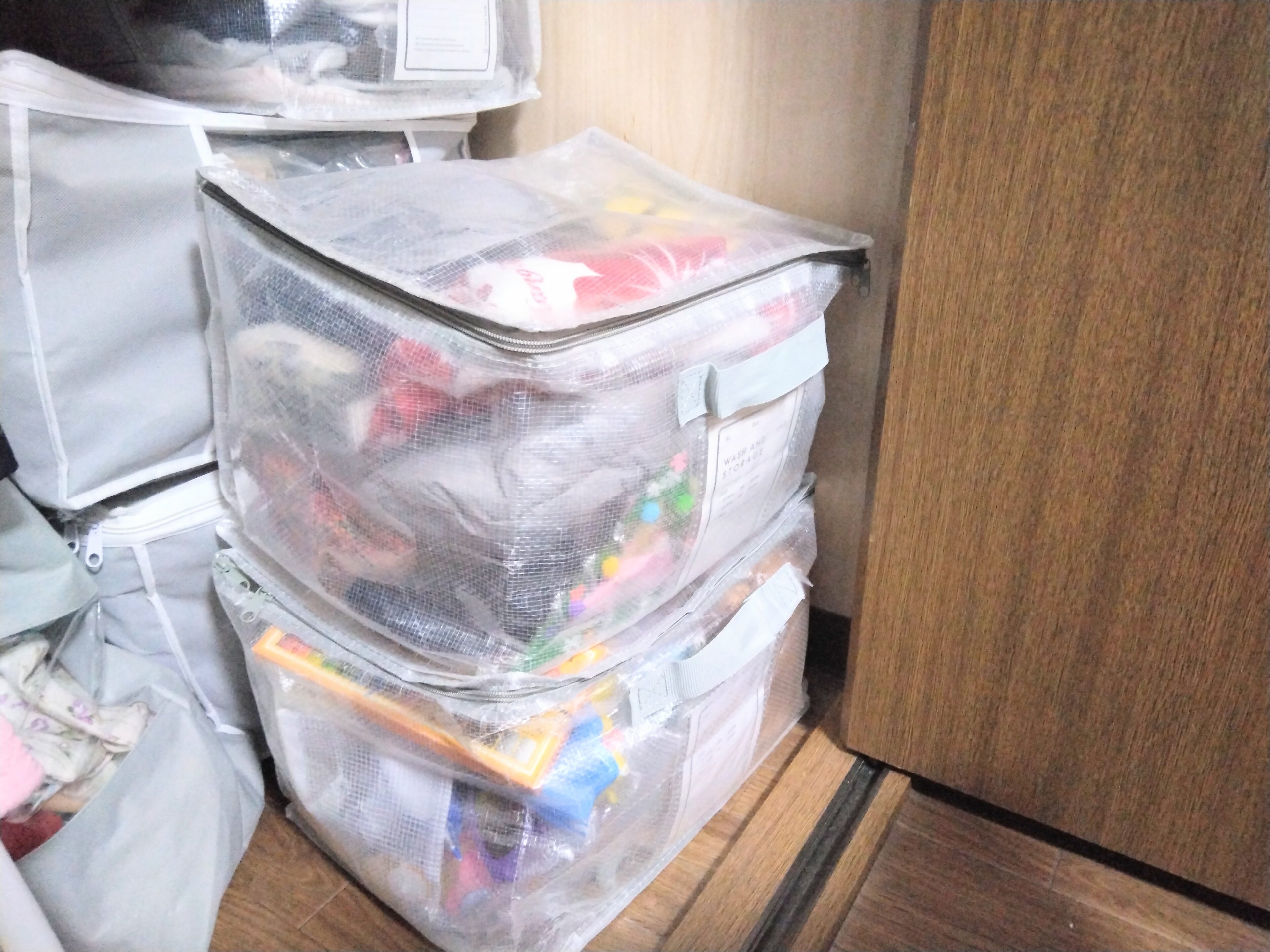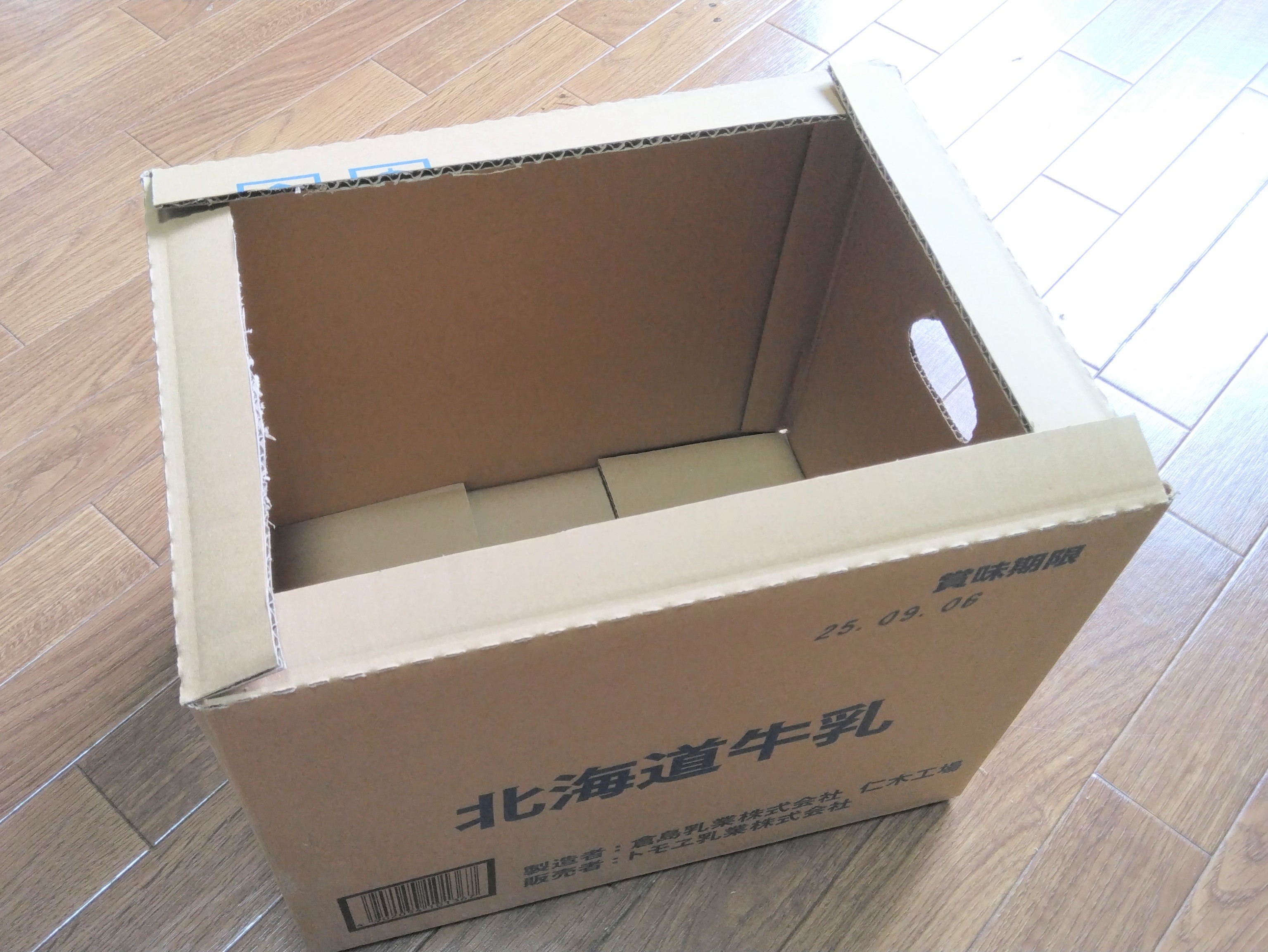 今回作ったものは、高さ25cm、縦21cm、横31cmの、1Lの牛乳が12本入っていたであろう段ボール。ものを入れた状態で最大4段重ねて問題無しでした。中身は不要なおもちゃ、虫よけや日焼け止め(未開封)など季節のものが主です。
