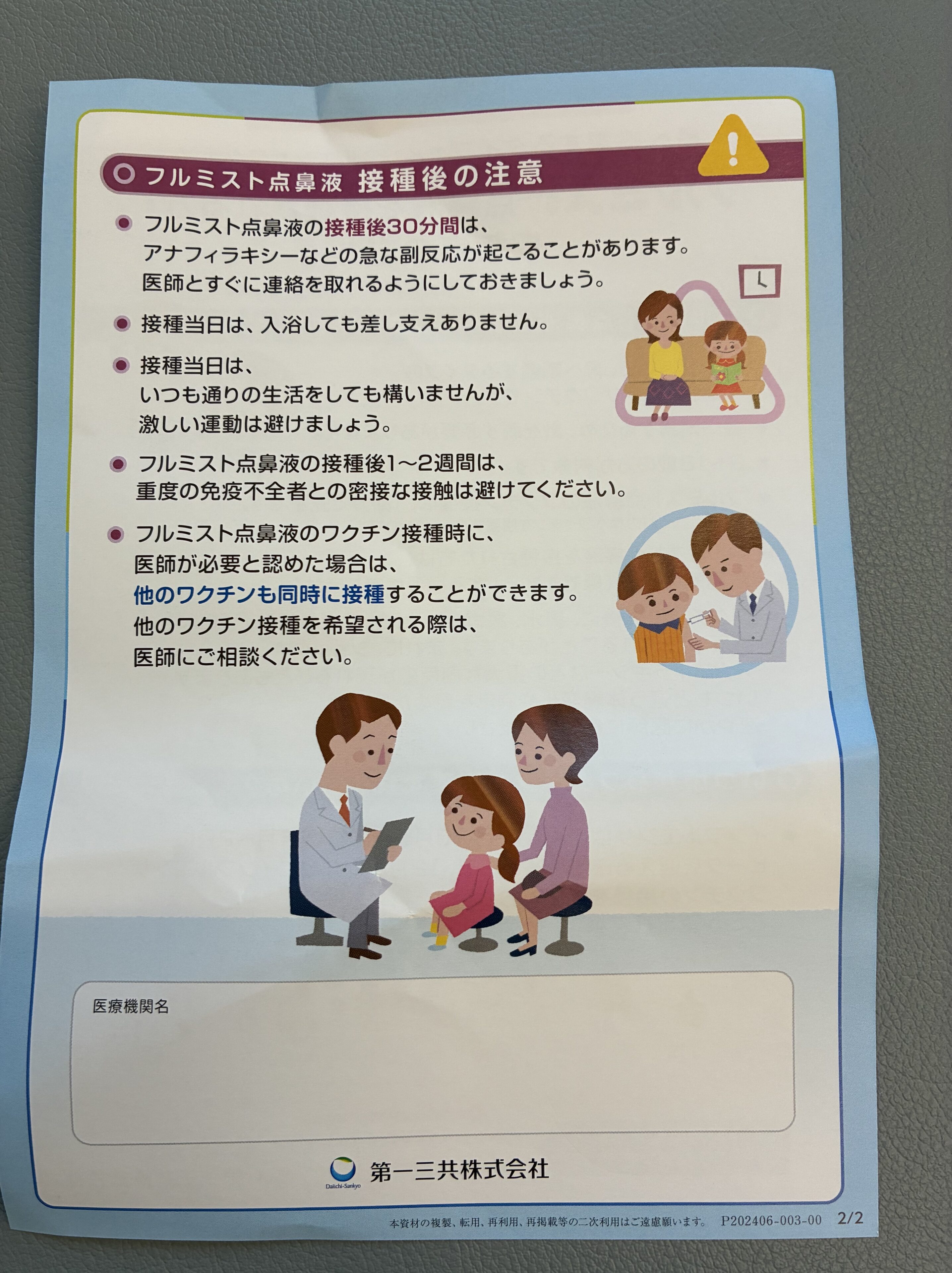 通常のインフルエンザワクチンは、13歳未満の子供は通常2回の接種が推奨されています。忙しい中で2回もクリニックへ通うスケジュールを調整するのは大変でした。