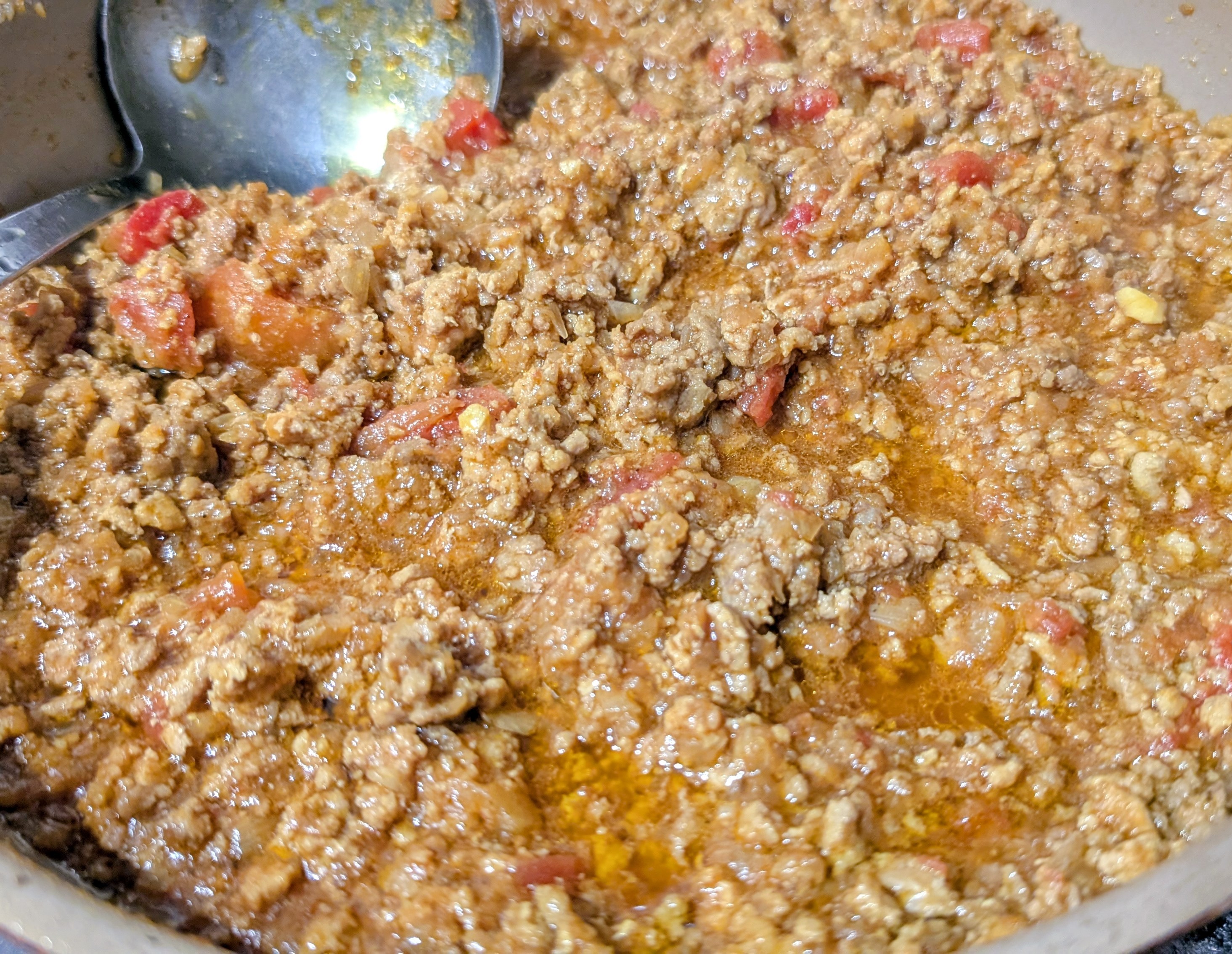 3. トマト缶を加え、しばらく煮込んで水分を軽く飛ばしながらかき混ぜて出来上がり。