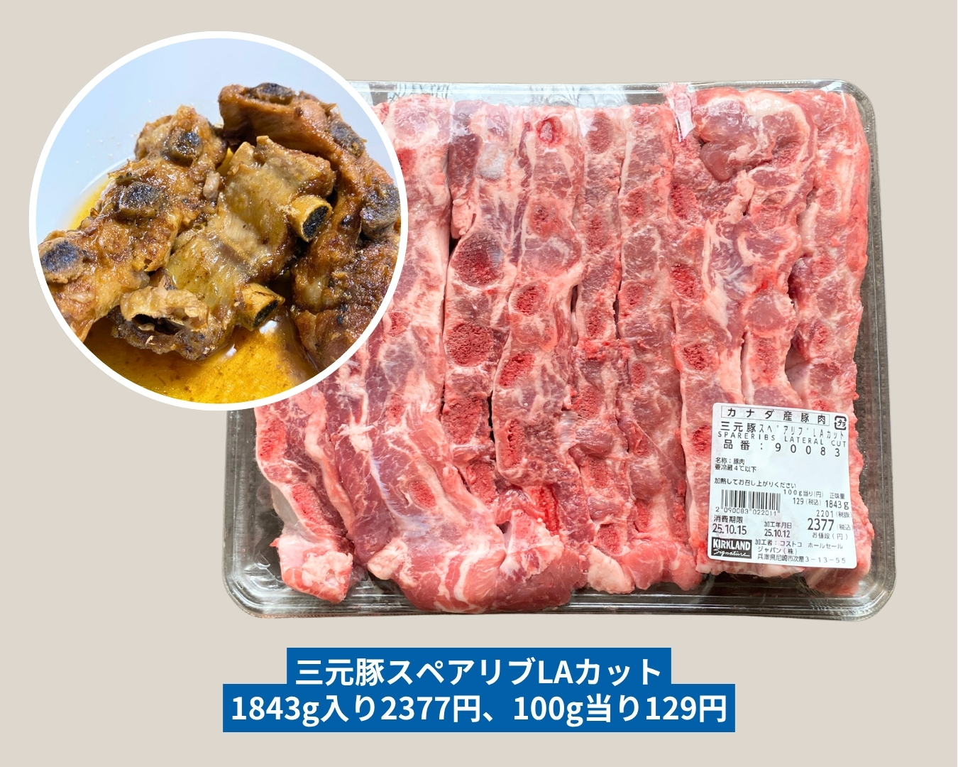 コスパ最高!「三元豚スペアリブLAカット」(1843g入り2377円、100g当り129円)