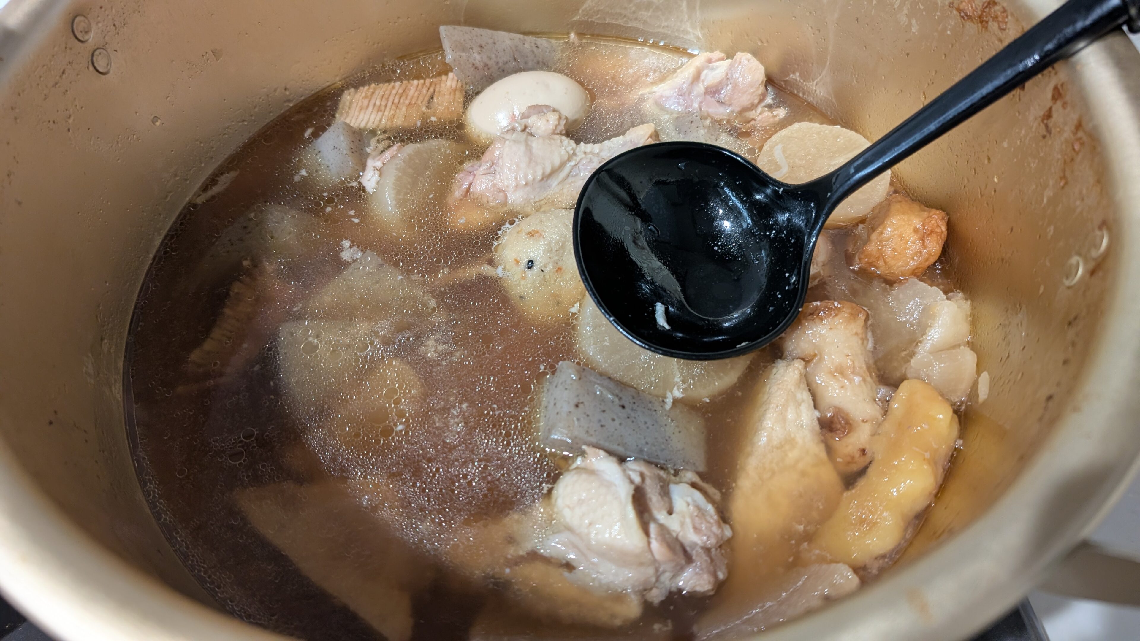 こんにゃく×3袋、しらたき×2袋、小さめの大根1本、卵15個、厚揚げ、焼きちくわ、ごぼ天、しょうが天、がんも多め、玉ねぎボール、すじ肉、手羽元、ベーコン。