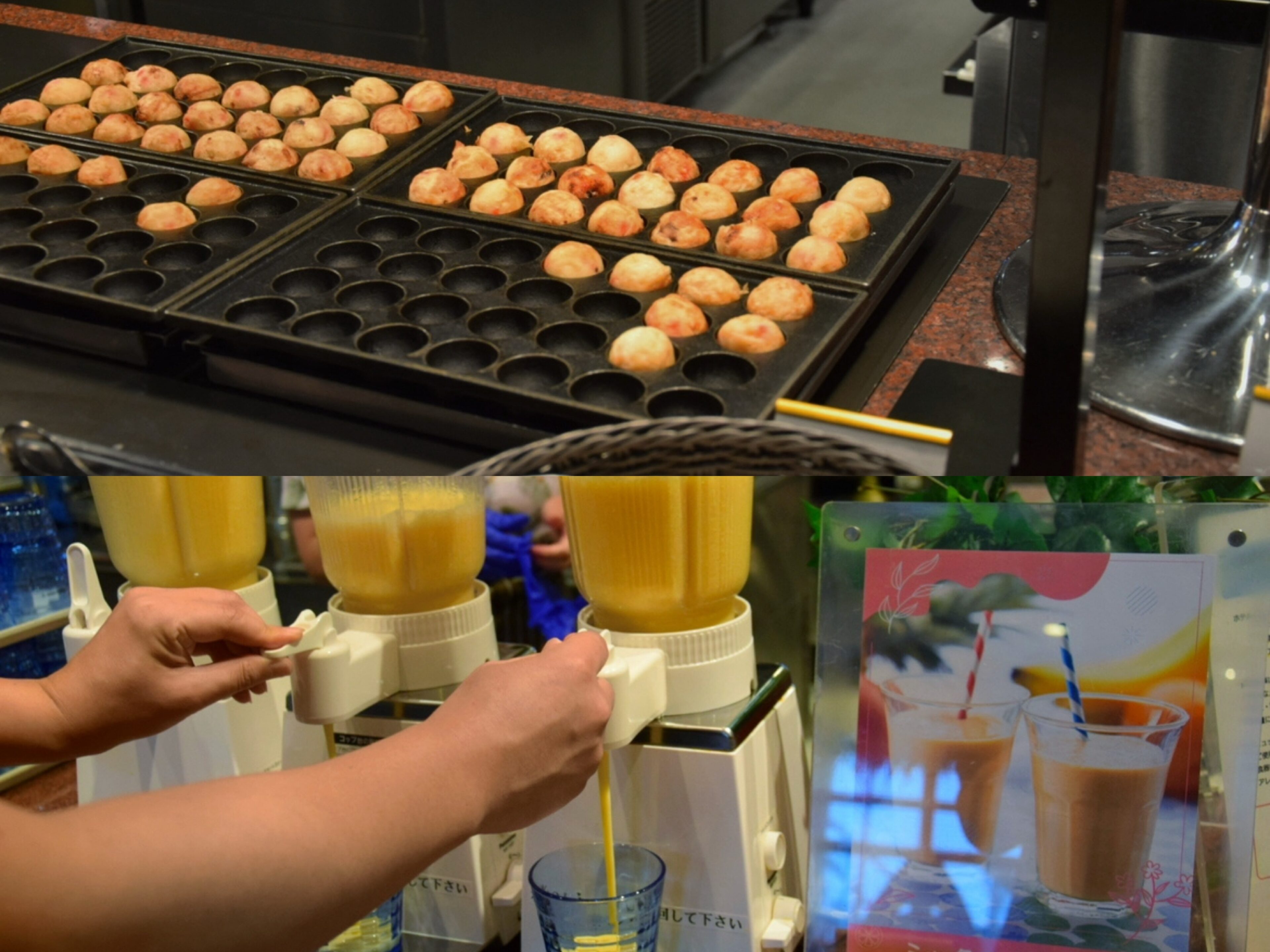 子どもが好きなパンケーキやフルーツだけでなく、たこ焼きやミックスジュースなど大阪ならではの味も楽しめます。