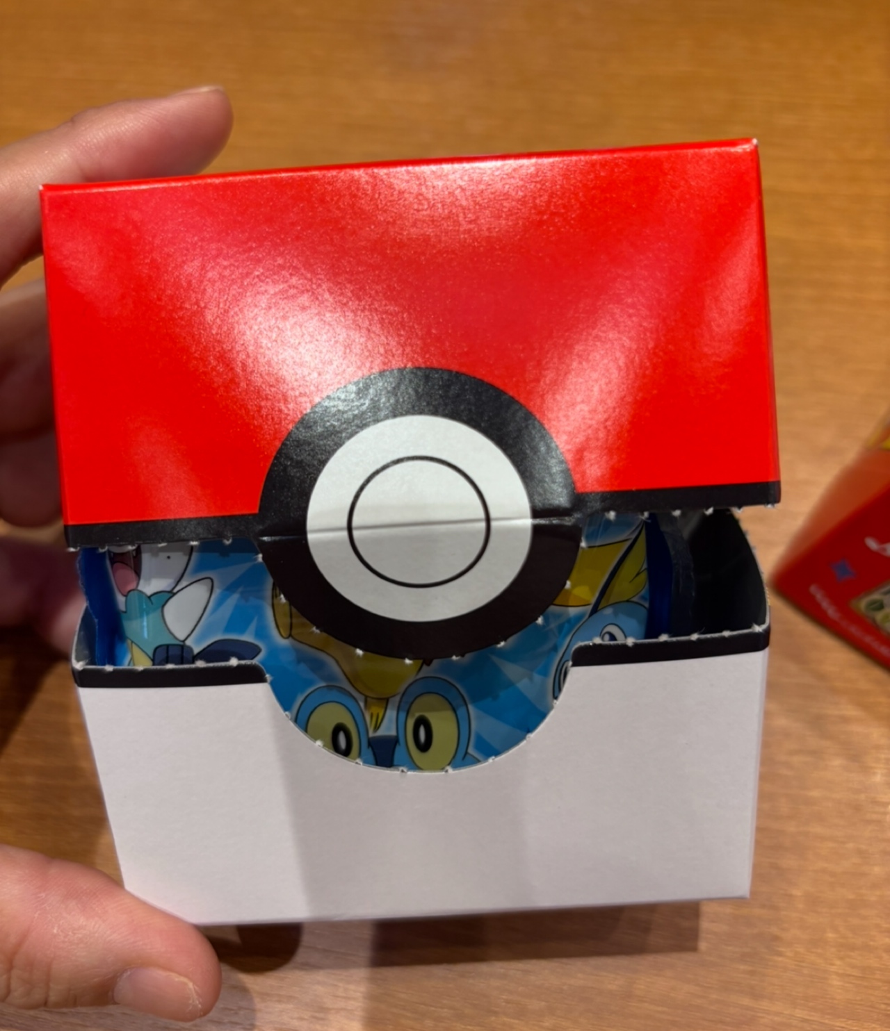 モンスターボールをイメージしたデザインの箱になっていて、それだけでも充分かわいいのですが、見た目だけではなく、箱が真ん中からパカッと割れるんです!