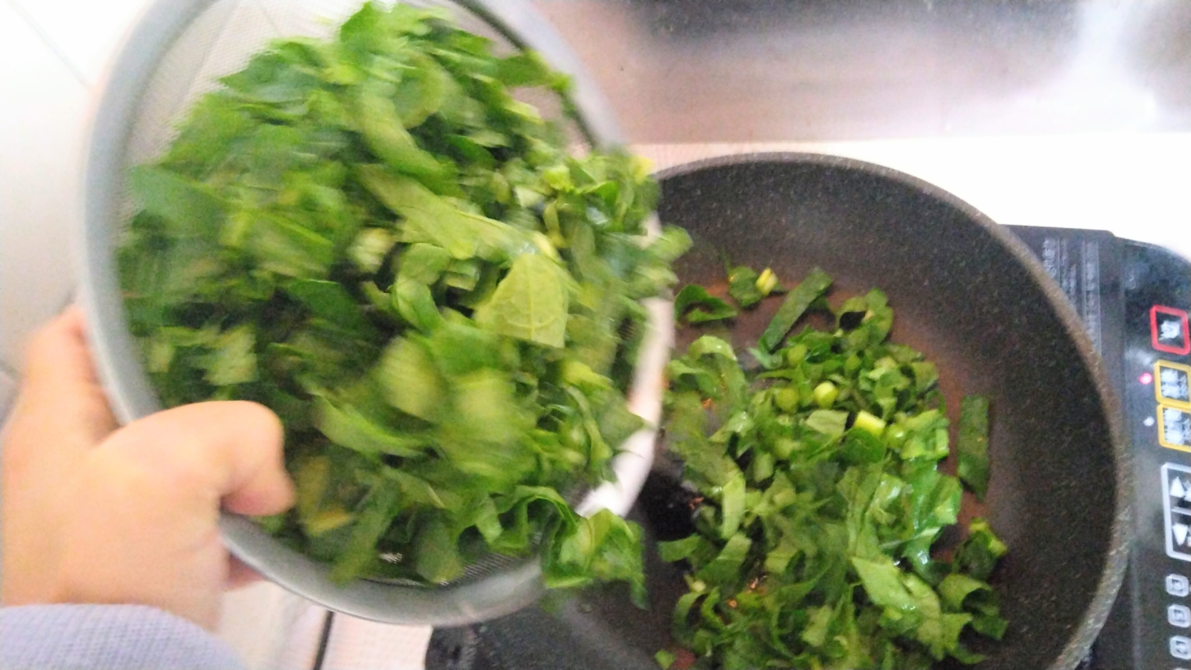 (3)多めのごま油を熱して、水を切った大根の葉を投入