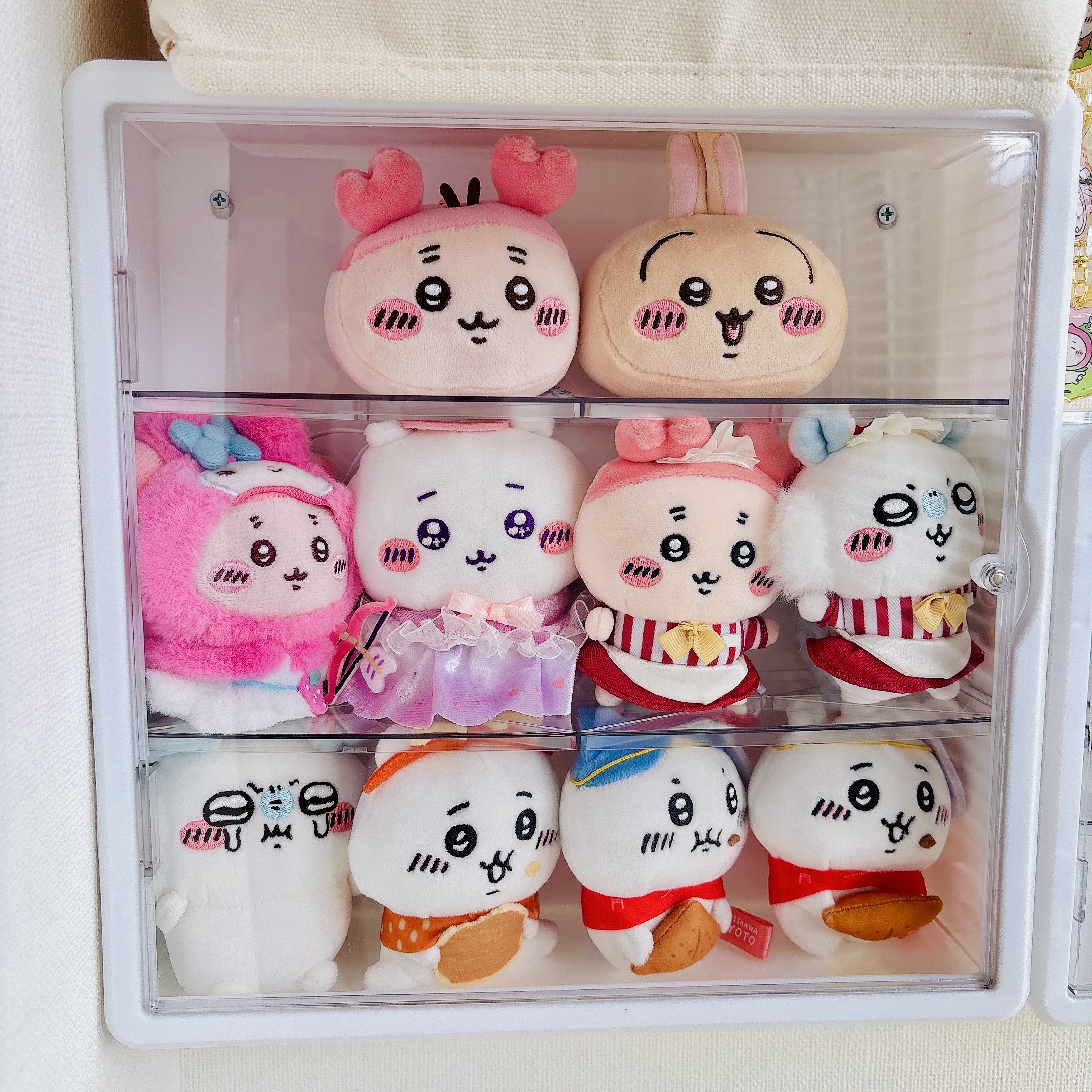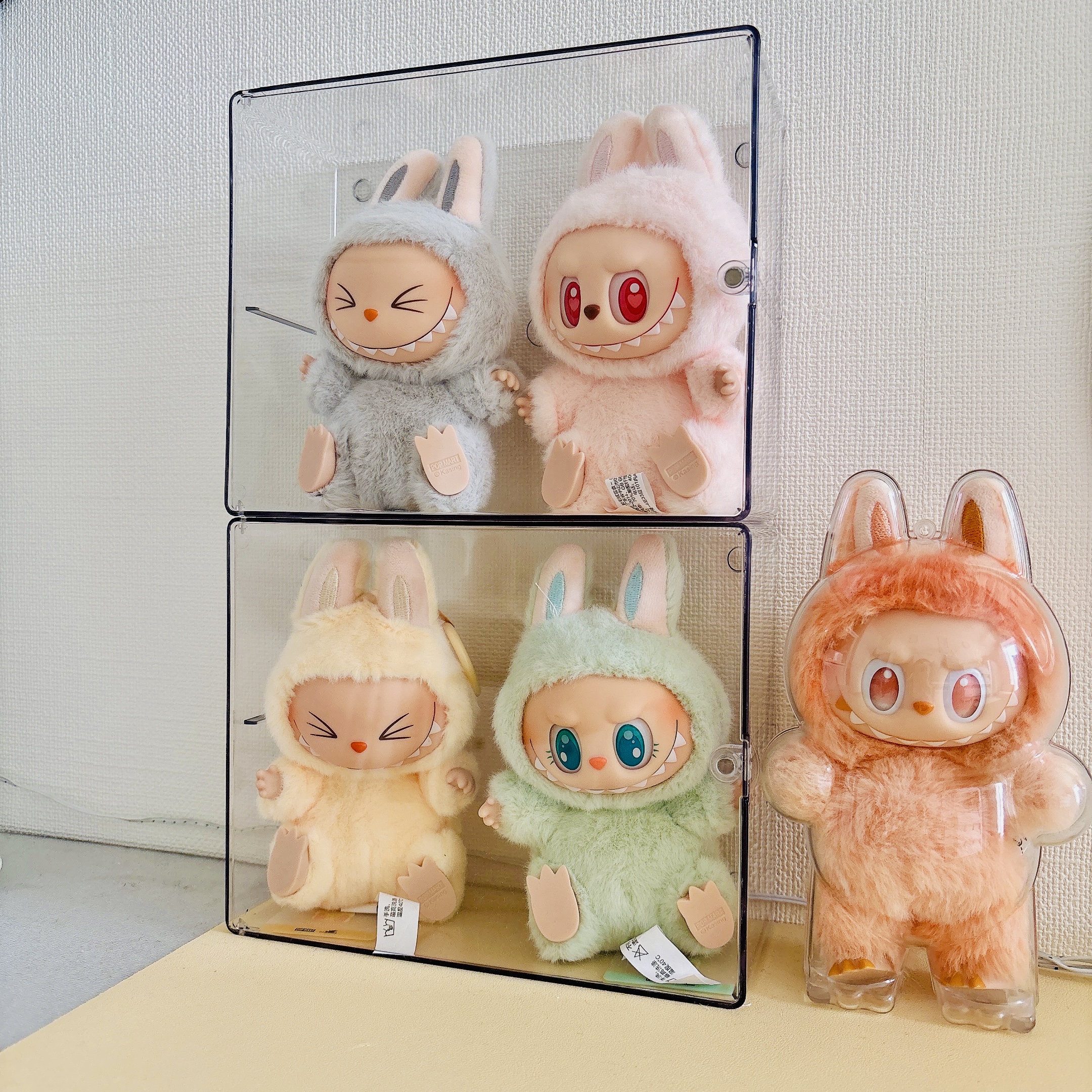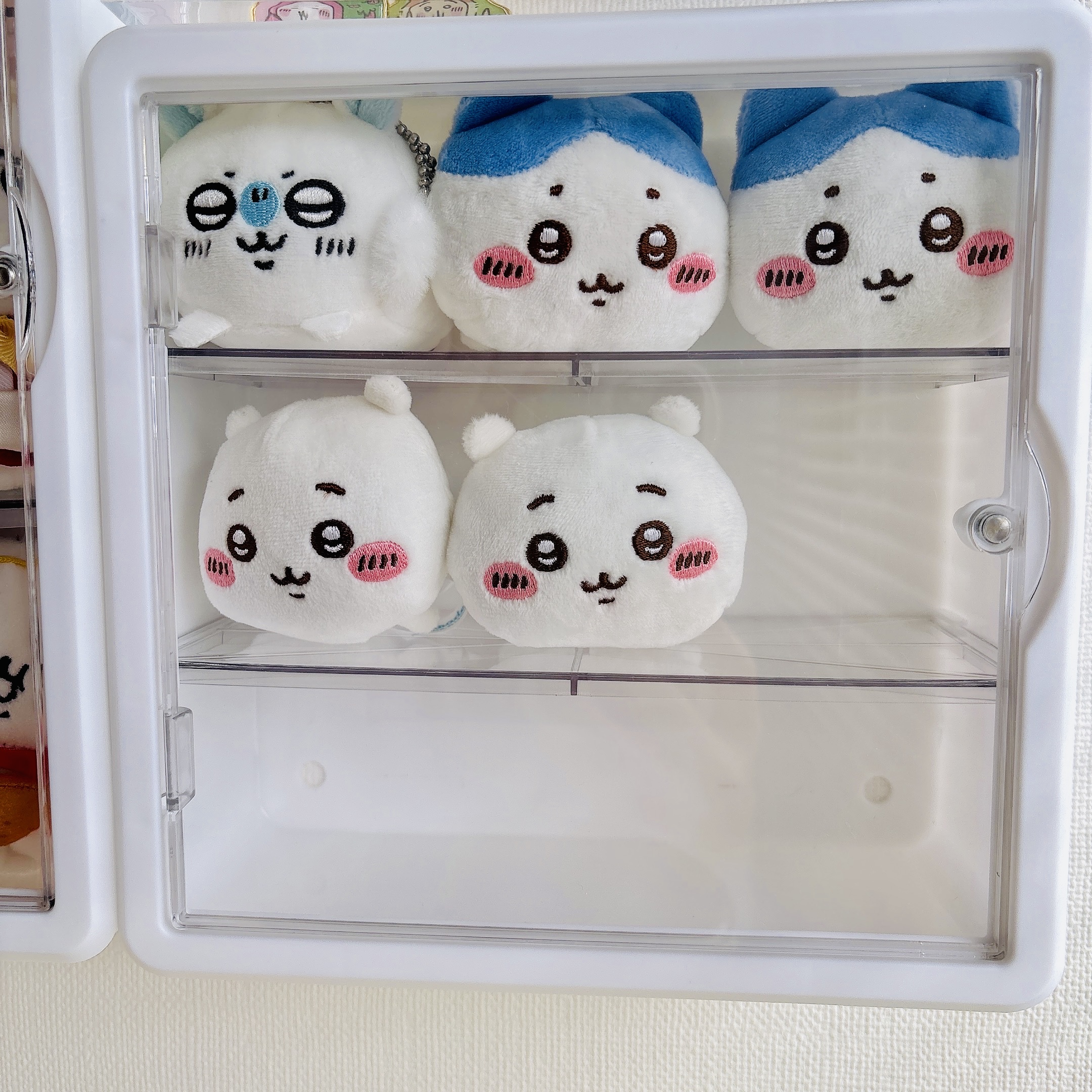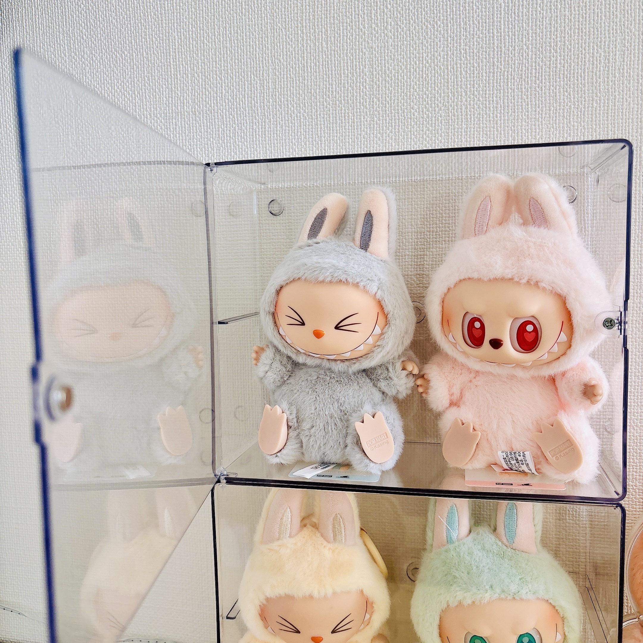 我が家はラブブの収納に使用していますが、2体ずつ可愛く収納できるのがおすすめです!こちらもダイソー購入品。扉開閉で中身が取りやすくなっていて、壁掛けOKです。こちらはうちでは直置きして使っています。このディスプレイケースは取り外し可能な仕切りがついていて、2段で使えるのですが、ぬいぐるみの大きさが仕切りを取った高さとまさにシンデレラフィット!仕切りを取った状態で2つ置いています!