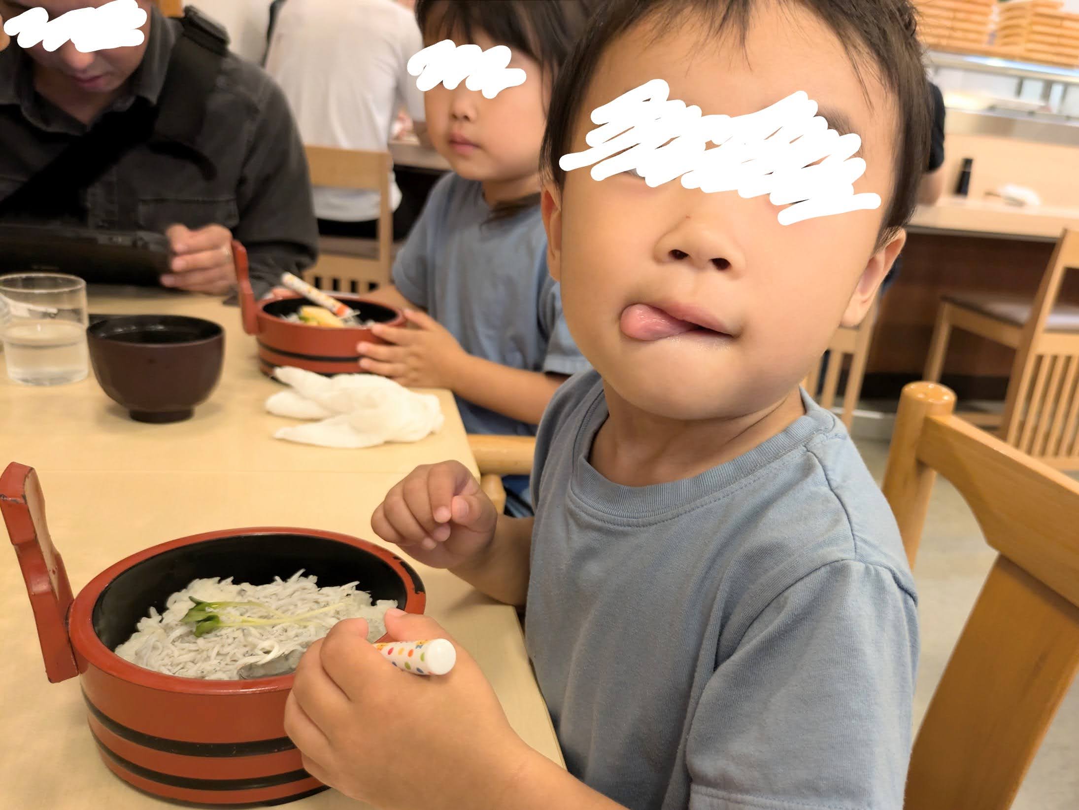 我が家がランチをしたのは「海花亭」。キッズメニューに海鮮丼と、まだ生魚を食べたことがない2歳の子どもでも食べられる釜揚げしらす丼があるため選びました。4歳の上の子はお刺身デビューしたので海鮮丼です。どちらも750円でした。