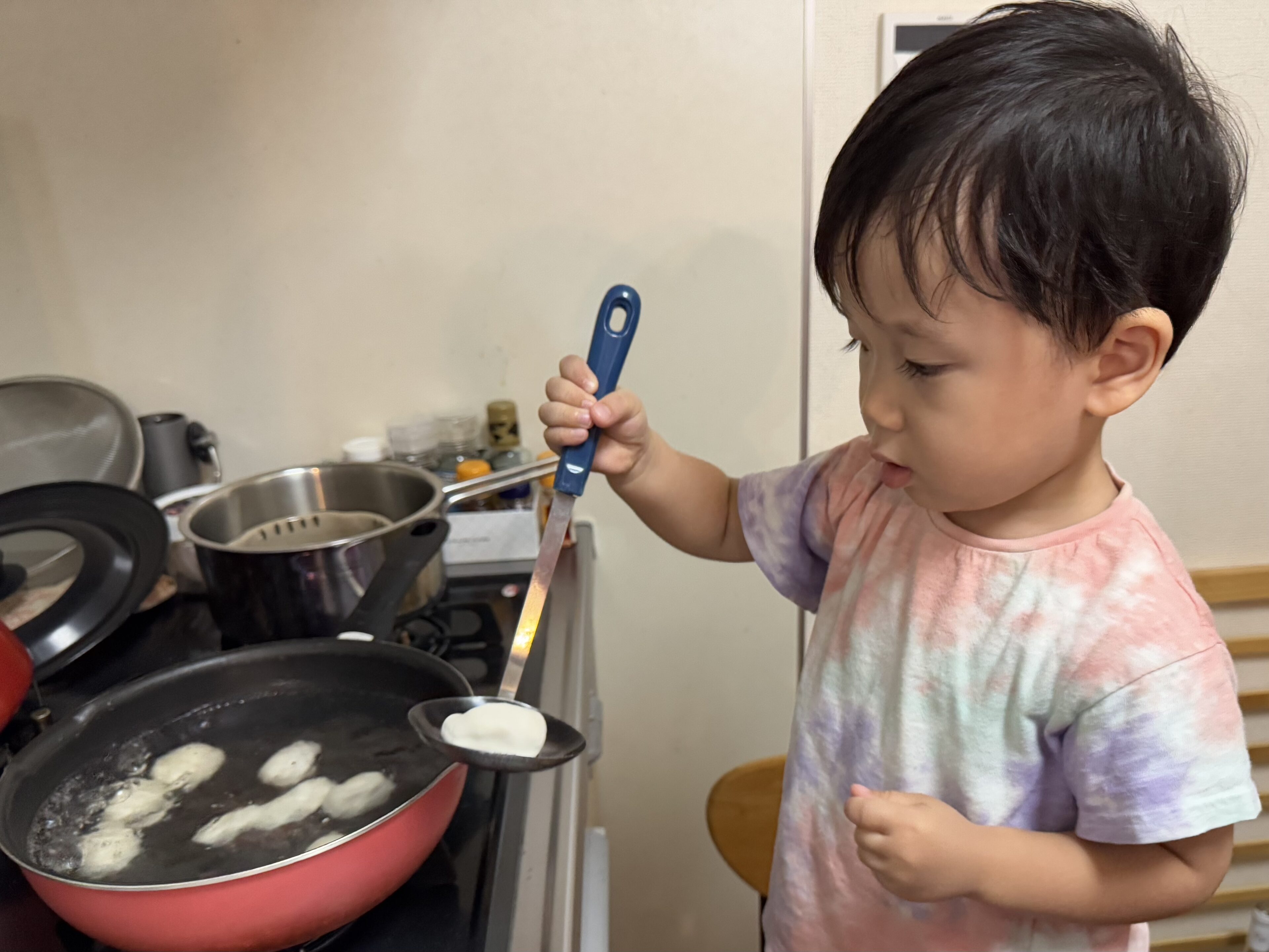 (2)火を使うときは火傷に注意。団子をゆでる際はお玉に乗せて、そっとお湯に入れる。