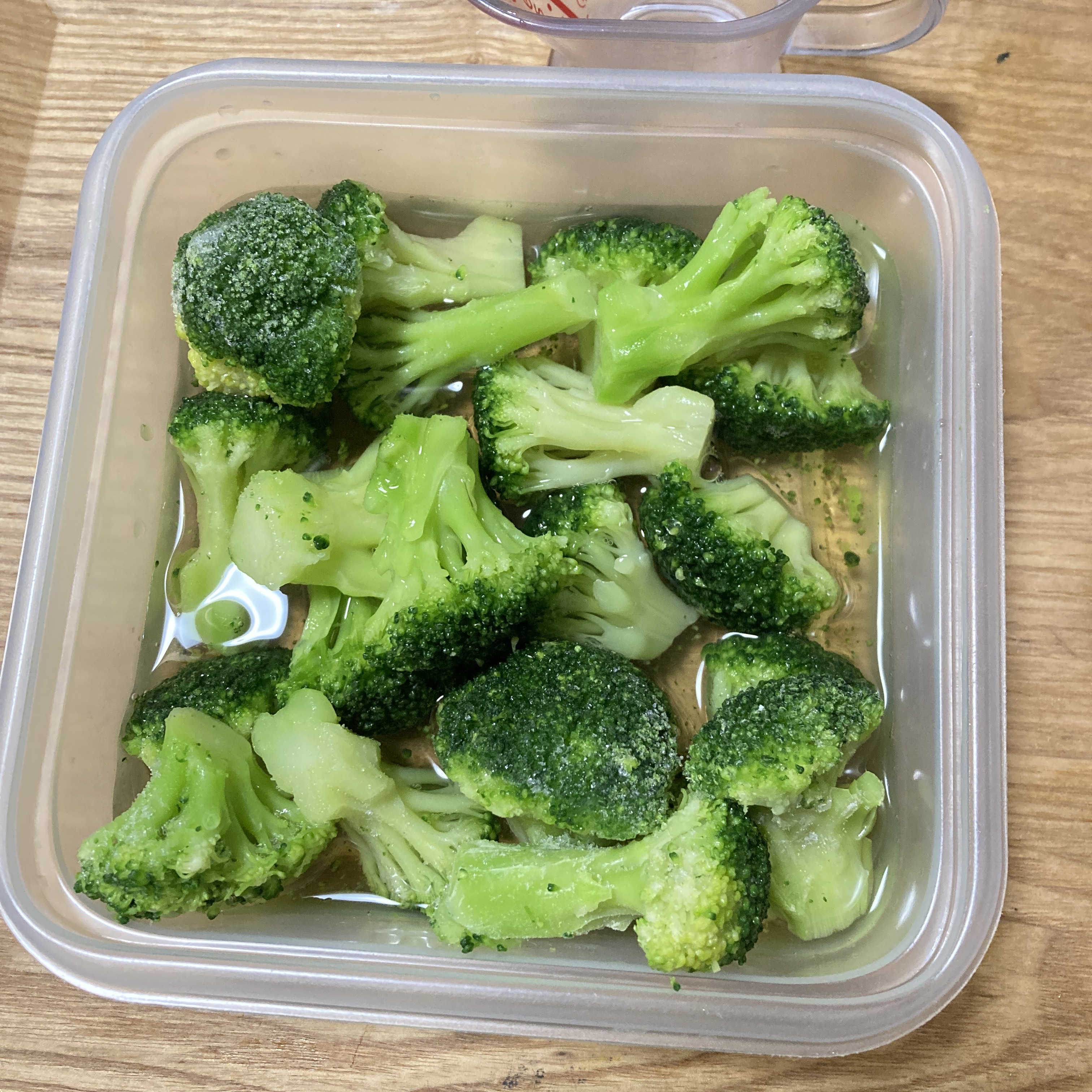 2.冷凍ブロッコリーを冷凍のまま、1の容器へ入れます。