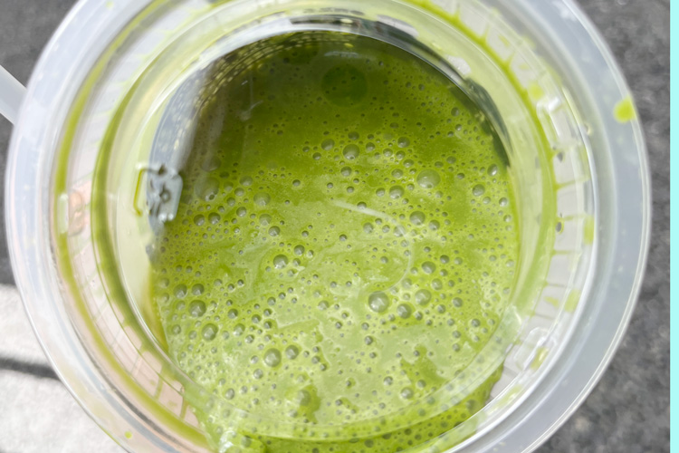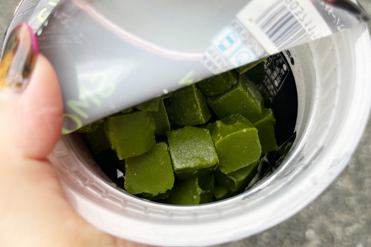 購入したスムージーを専用マシンにかける前は、濃い緑色の抹茶キューブがゴロゴロと入っています。