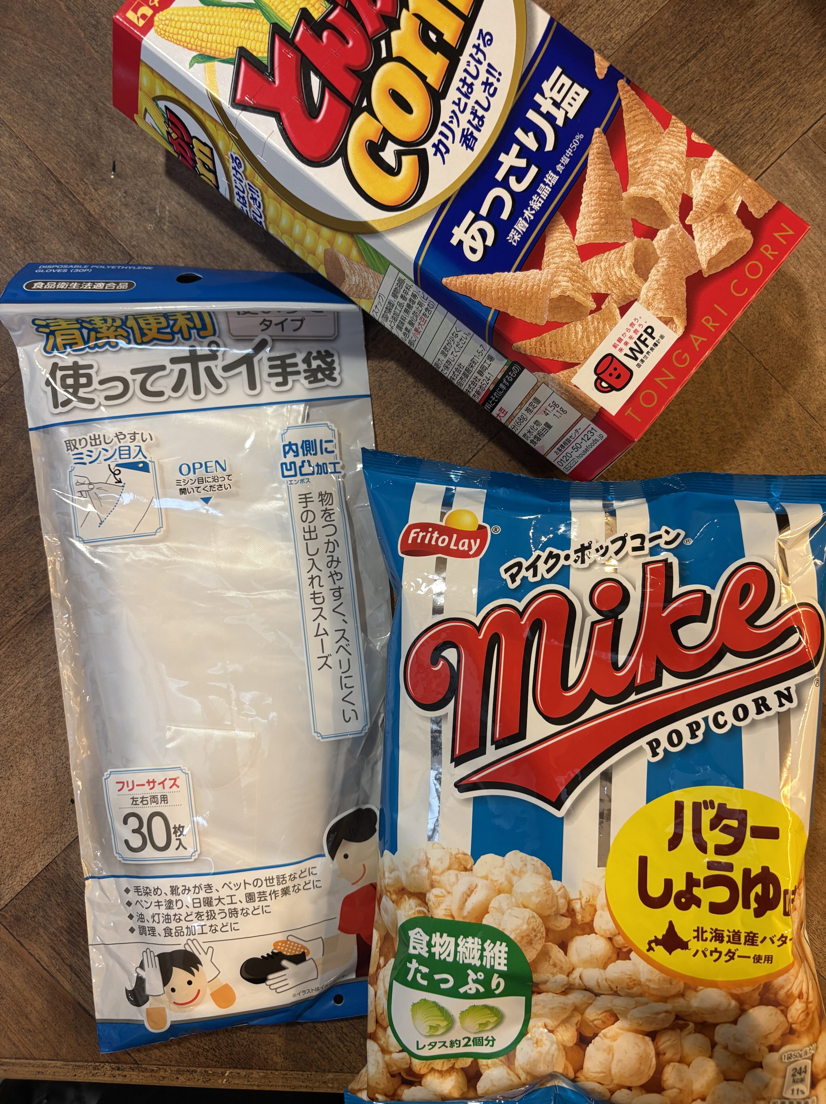 透明手袋、とんがりコーン、ポップコーン、あとはサインペンや、閉じる時に使うマスキングテープかリボンなど。