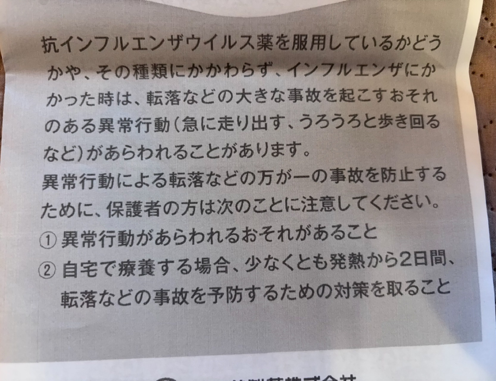 インフルエンザなどに感染した際に、異常行動が稀に起きる事があるかもしれないという事はニュースなどで知っていましたが、今回改めて書面での説明をいただきました。