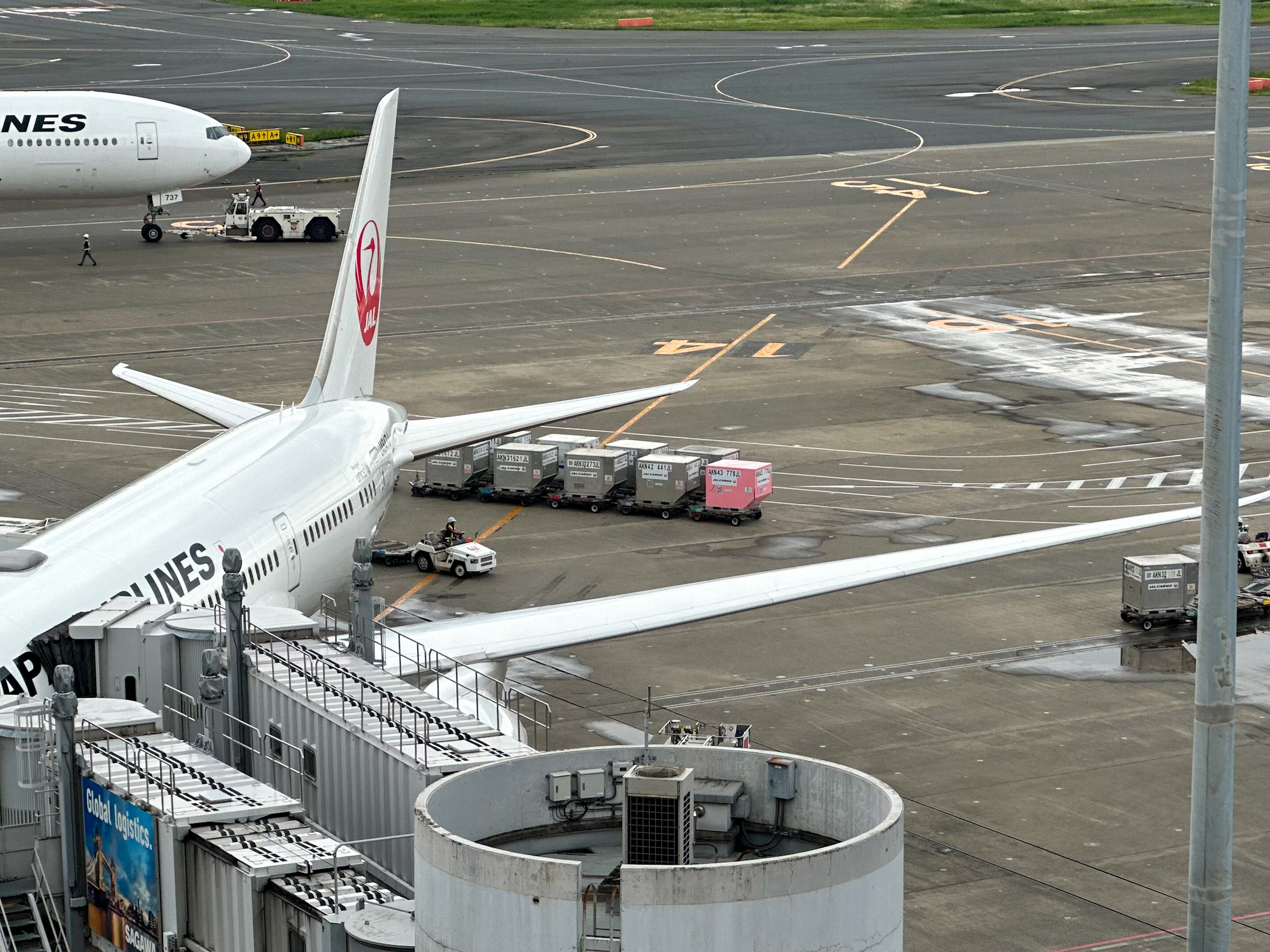 JALの貨物エリアに、いつもと違う色のコンテナを見つけました。グレーのコンテナが多い中で、ひときわ目立つピンクのコンテナ。