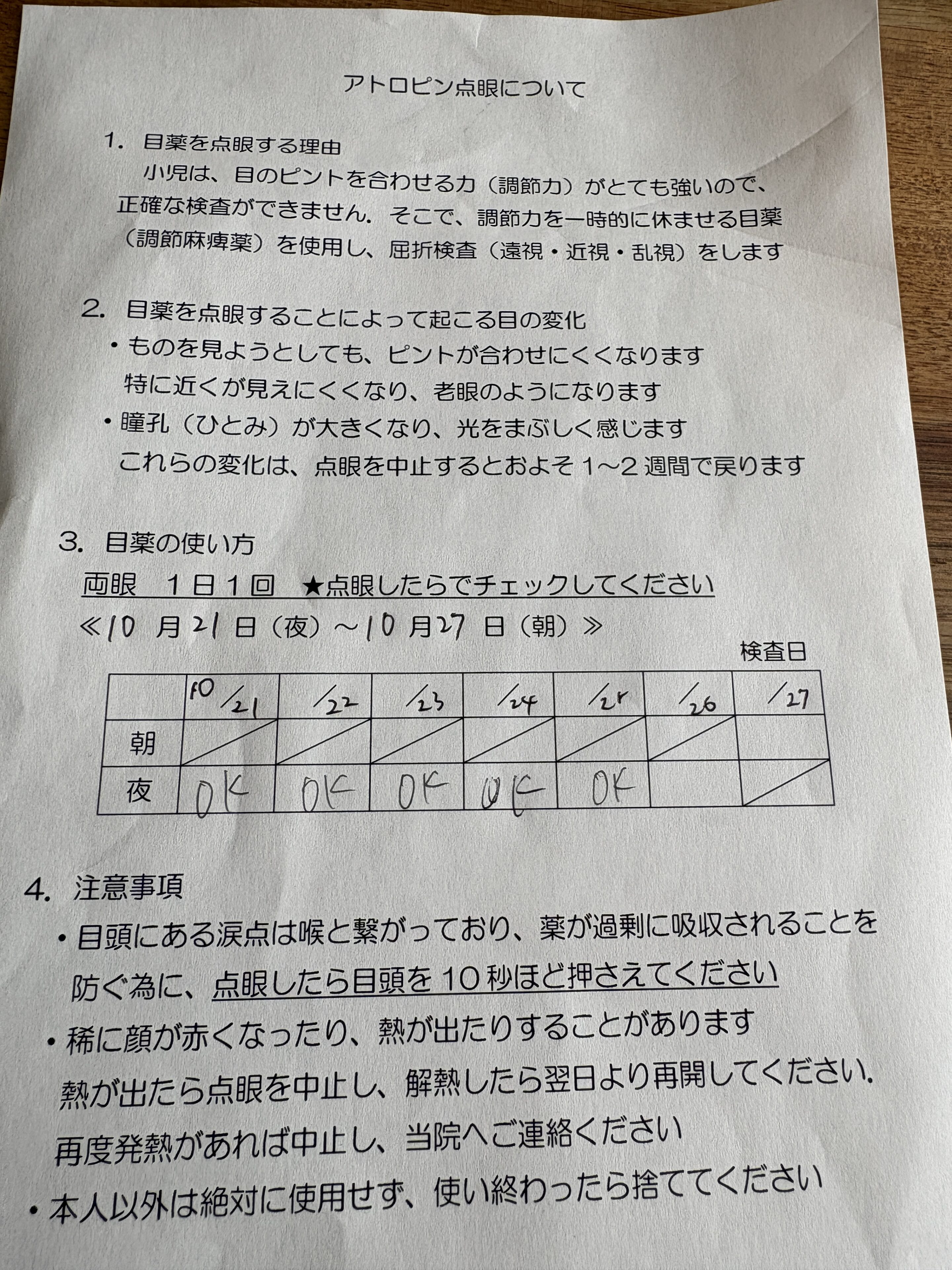 瞳孔を開く目薬を5日間投薬したあと検査を行いました。この目薬の副作用が娘には結構応えたようで…投薬中は機嫌が悪かったです(泣)。光が眩しくなりすぎたり、目薬をさすときに染みるのが辛かったようでした。