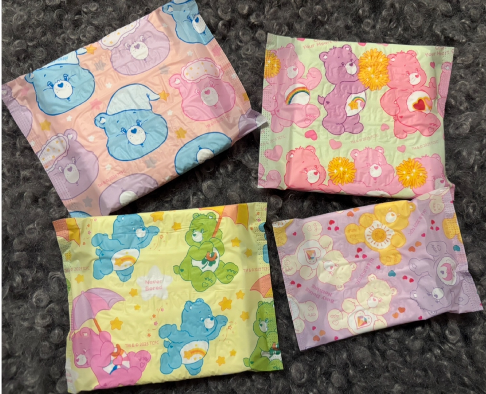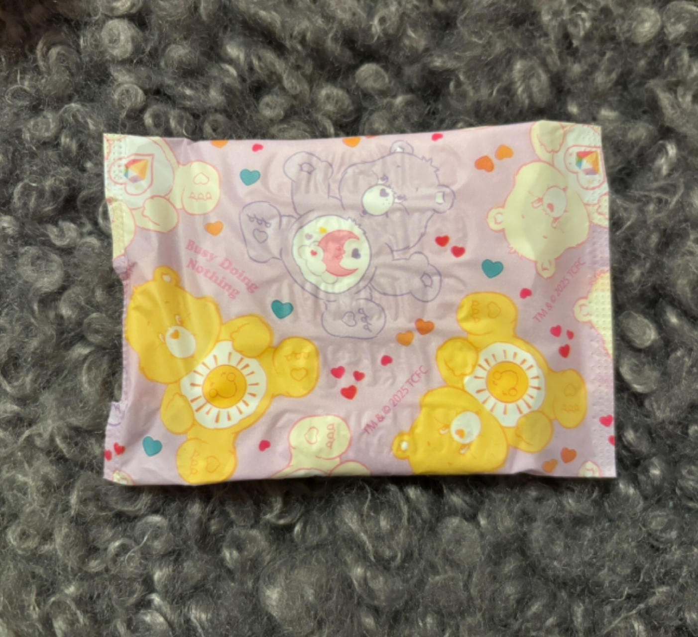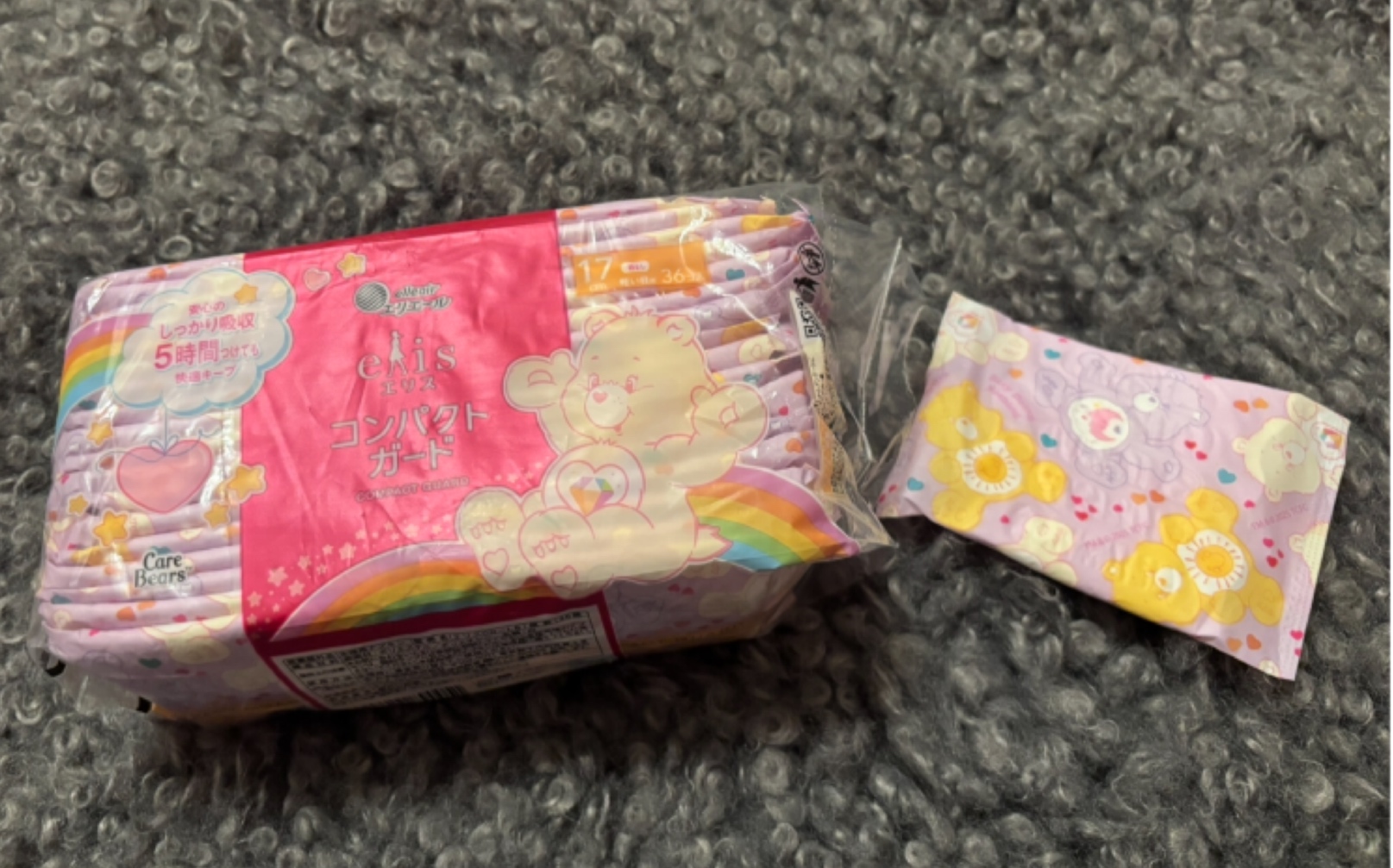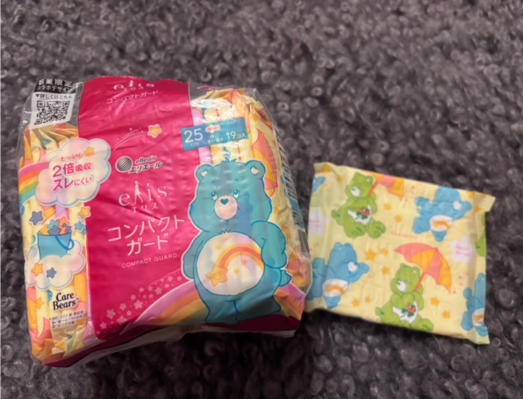 大人気のキャラクター「ケアベア」のプリントがめちゃくちゃ可愛いこの商品は、なんと生理用ナプキンなんです!