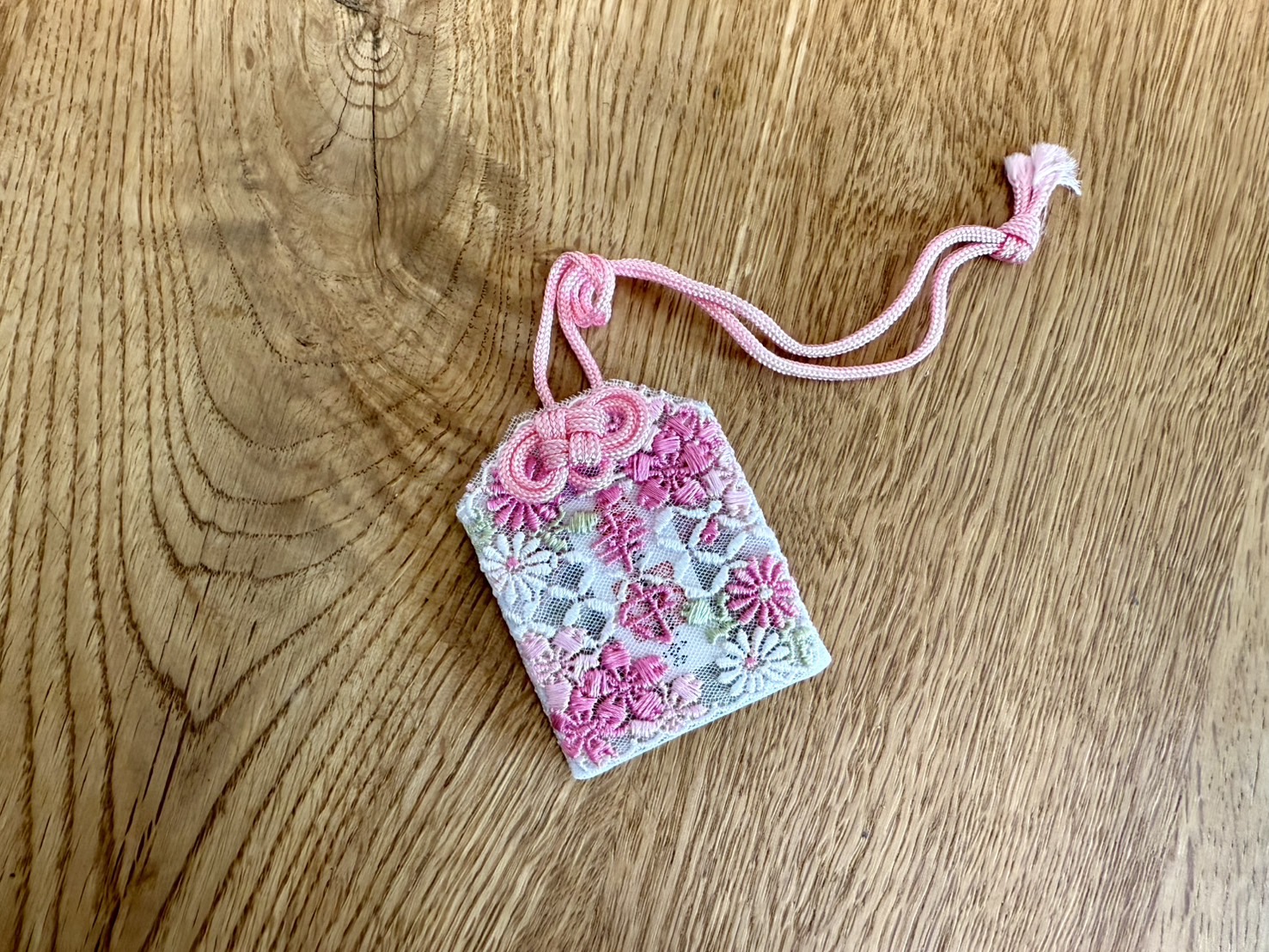 オーガンジーに施された花の刺繍が可憐で、内符は透明。かわいくて美しいお守りです。