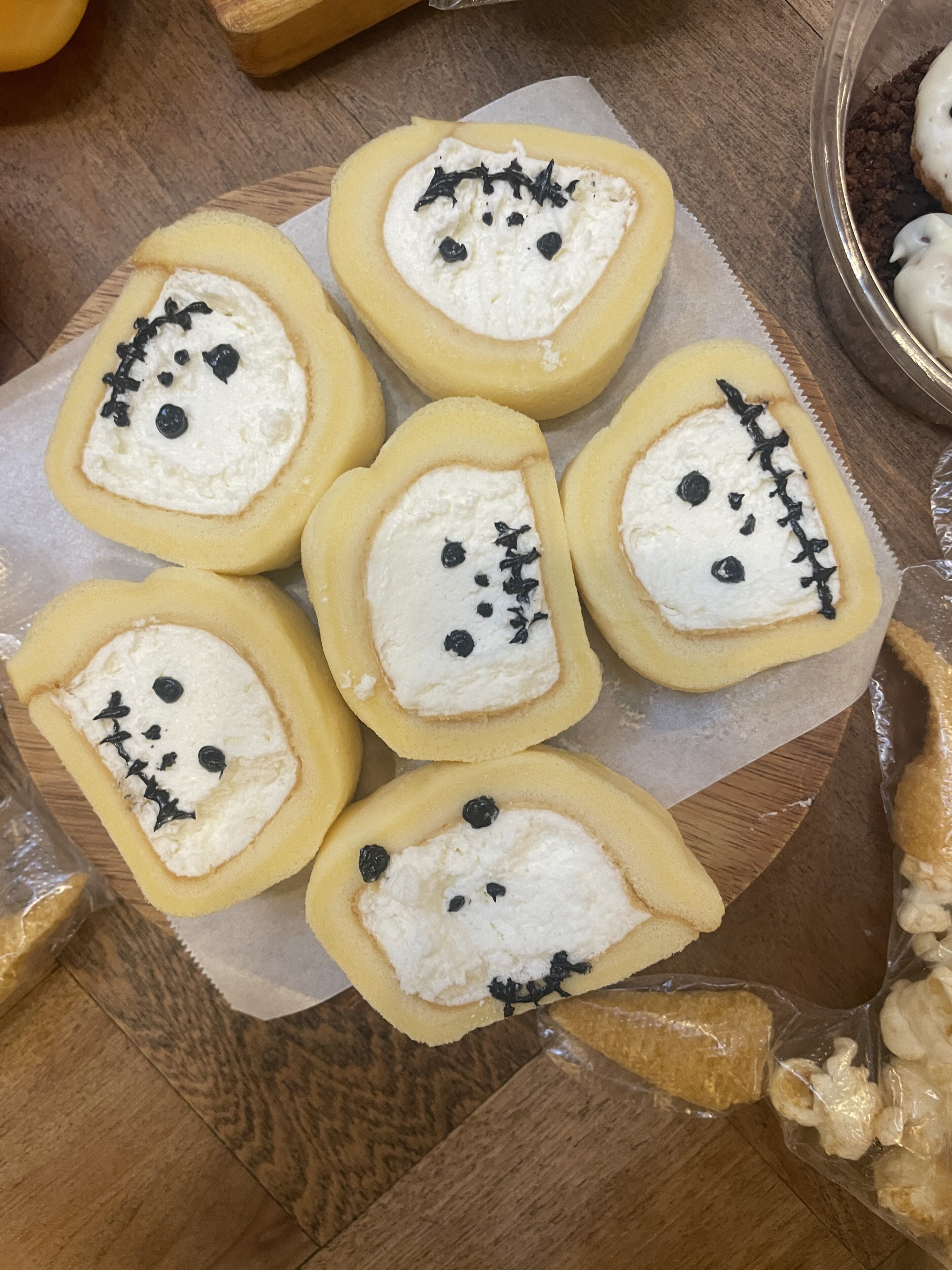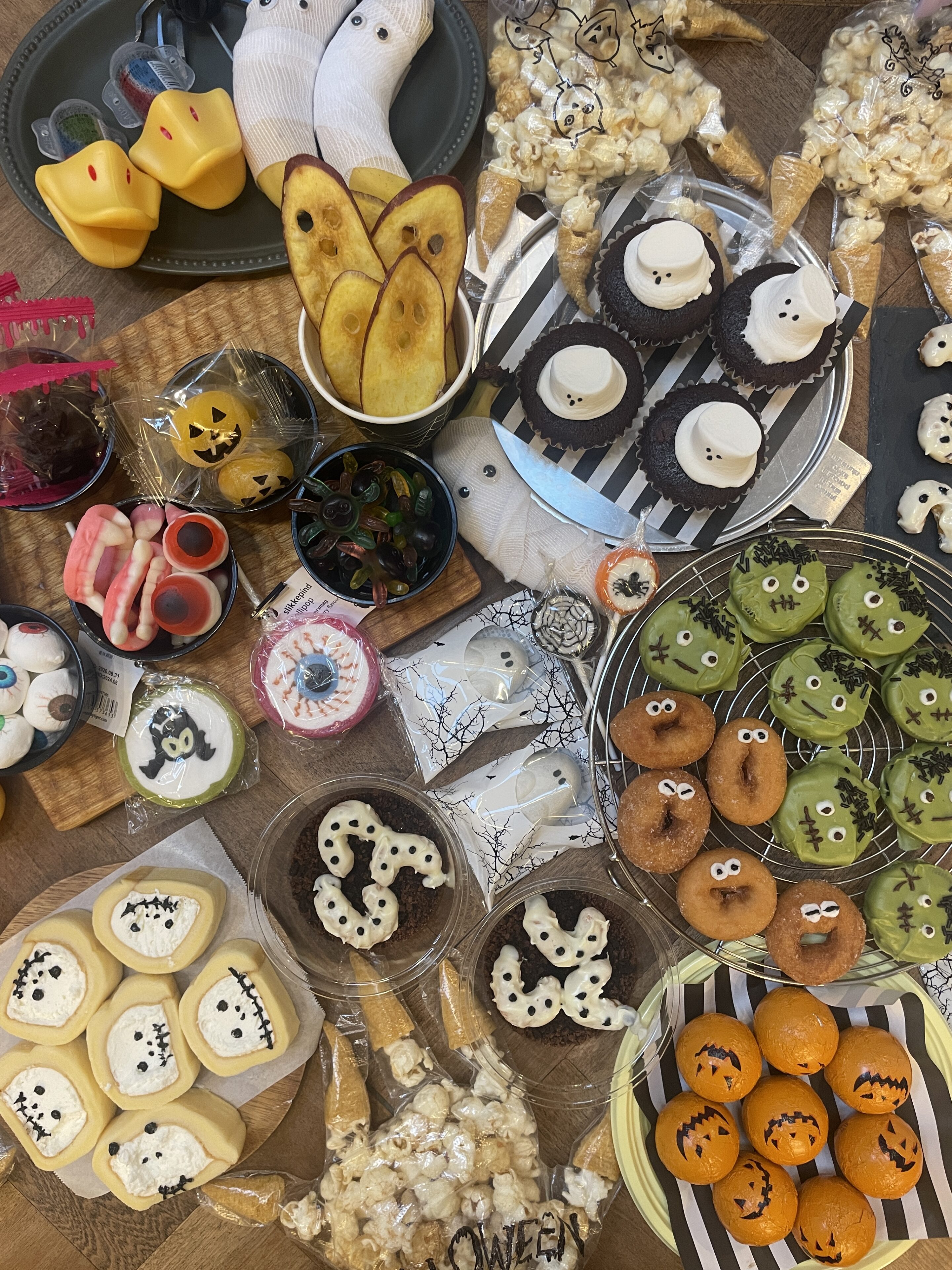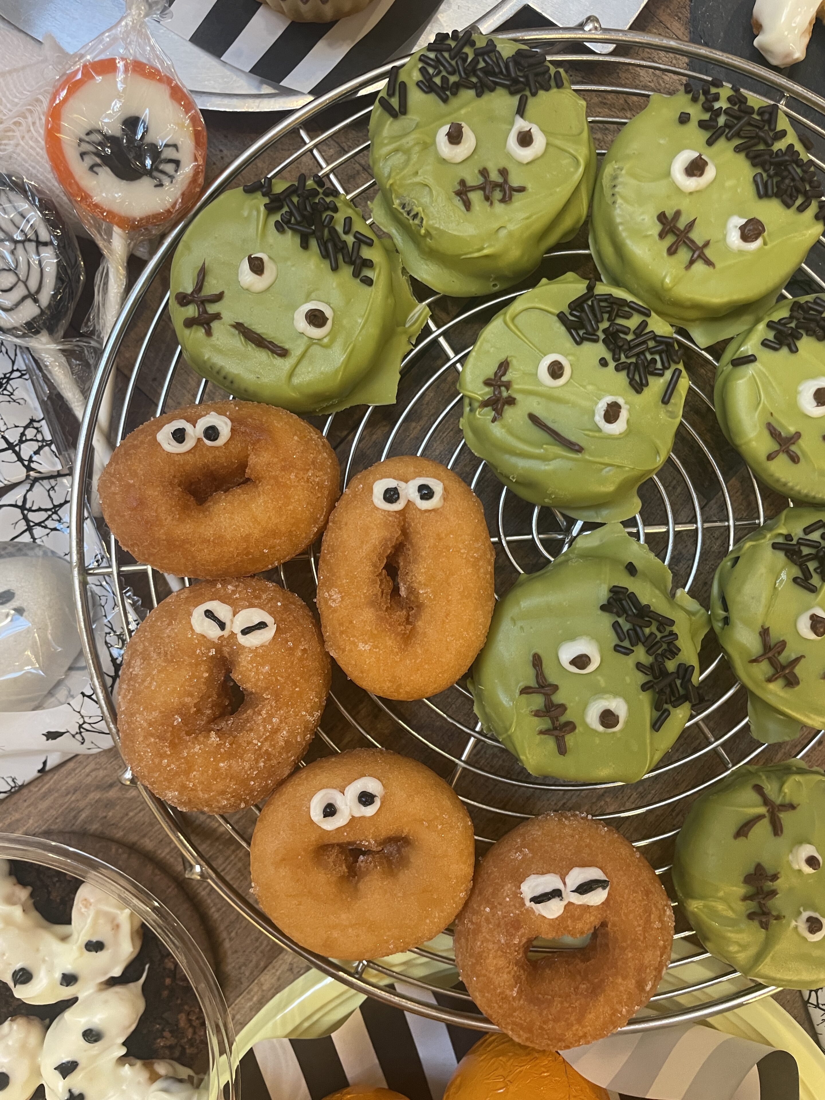 オレオを抹茶チョコでコーティングして、デコレーションして、フランケンシュタインを作ったり、ドーナツに目をつけたりと、他にも色々しました。