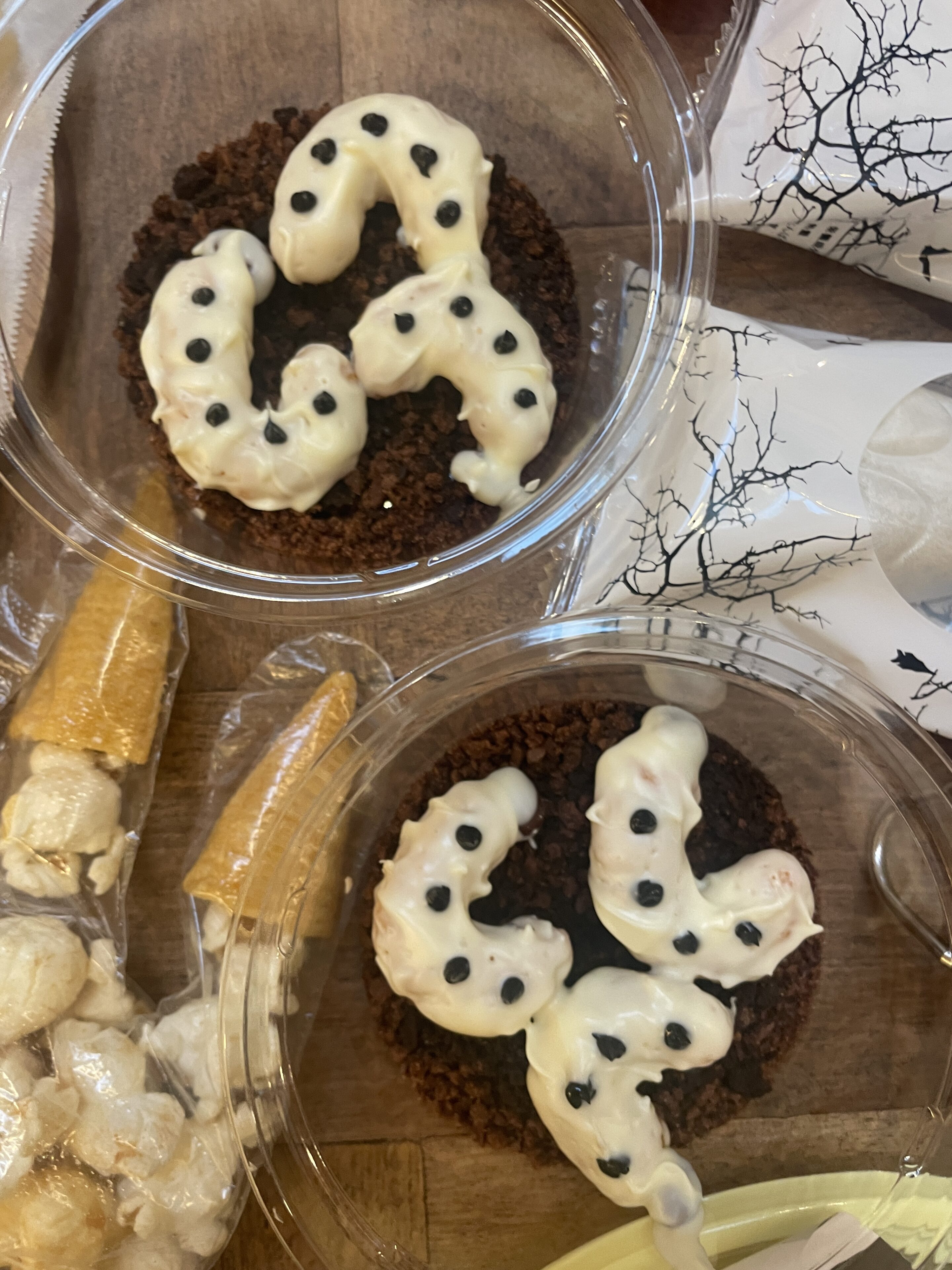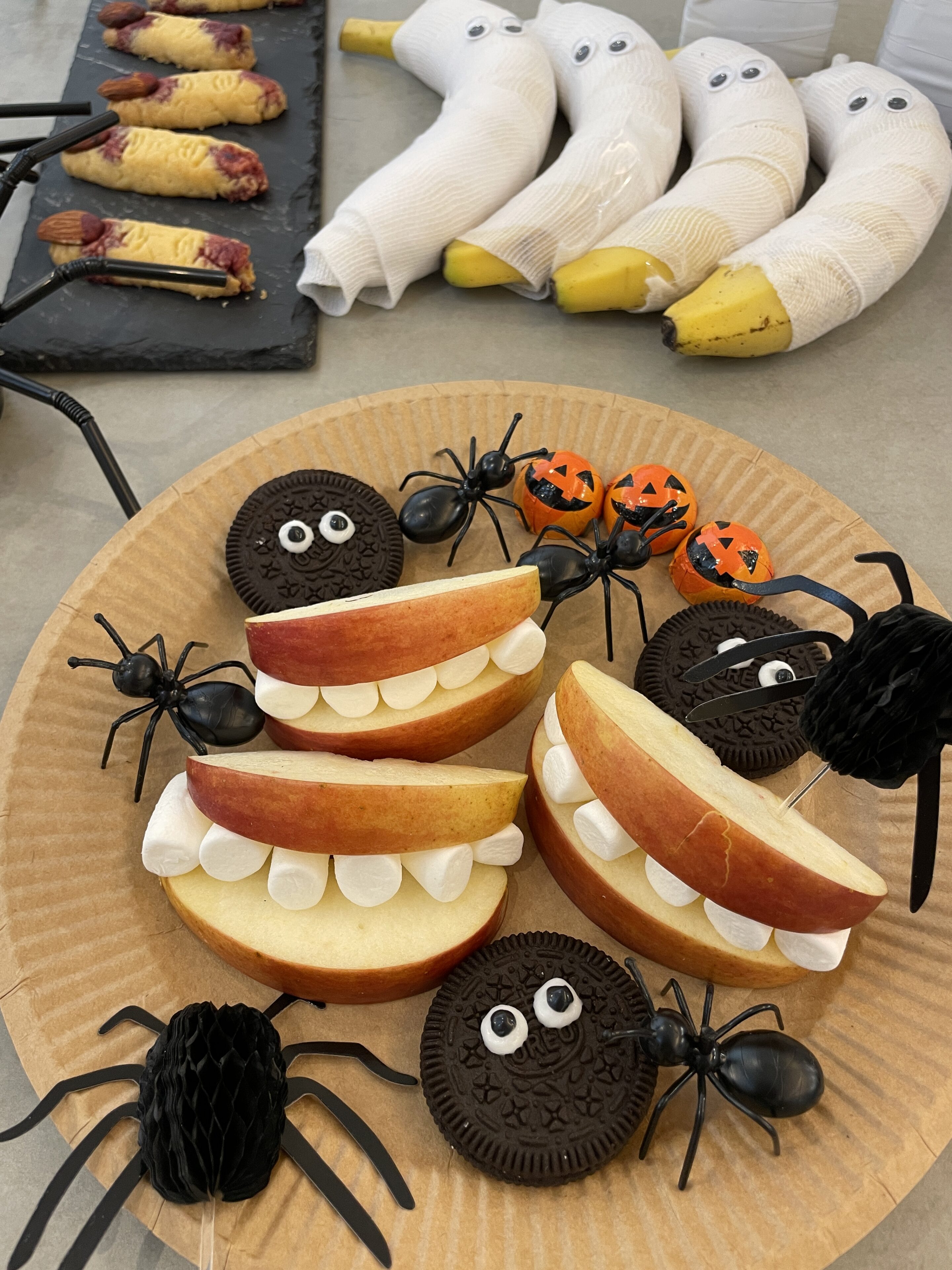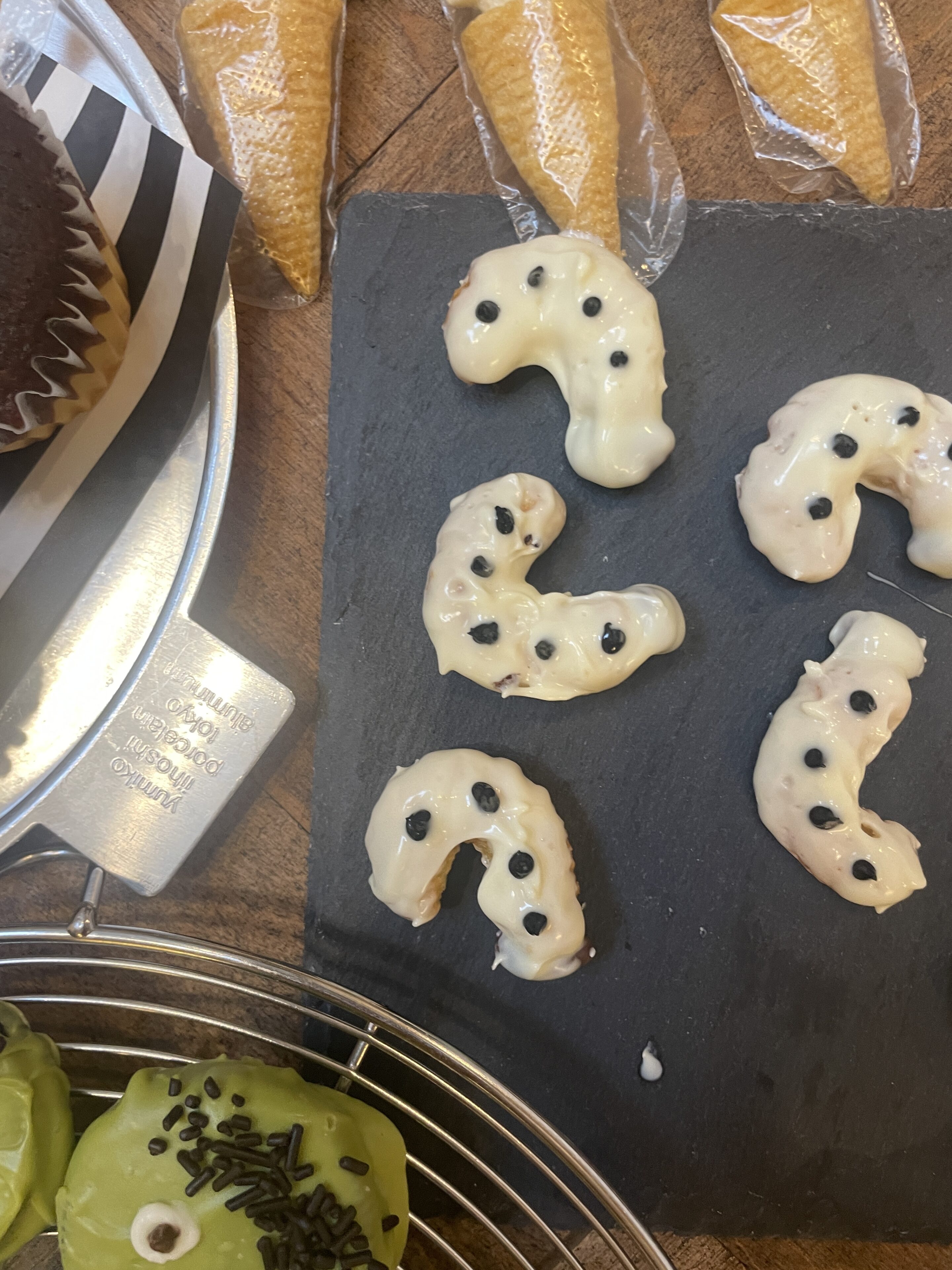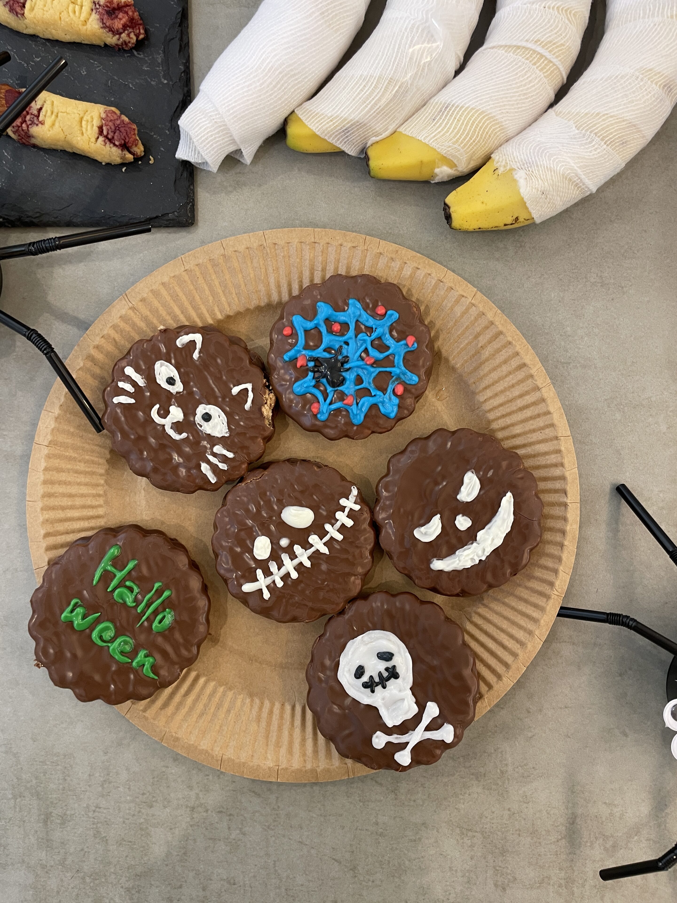 オレオを抹茶チョコでコーティングして、デコレーションして、フランケンシュタインを作ったり、ドーナツに目をつけたりと、他にも色々しました。