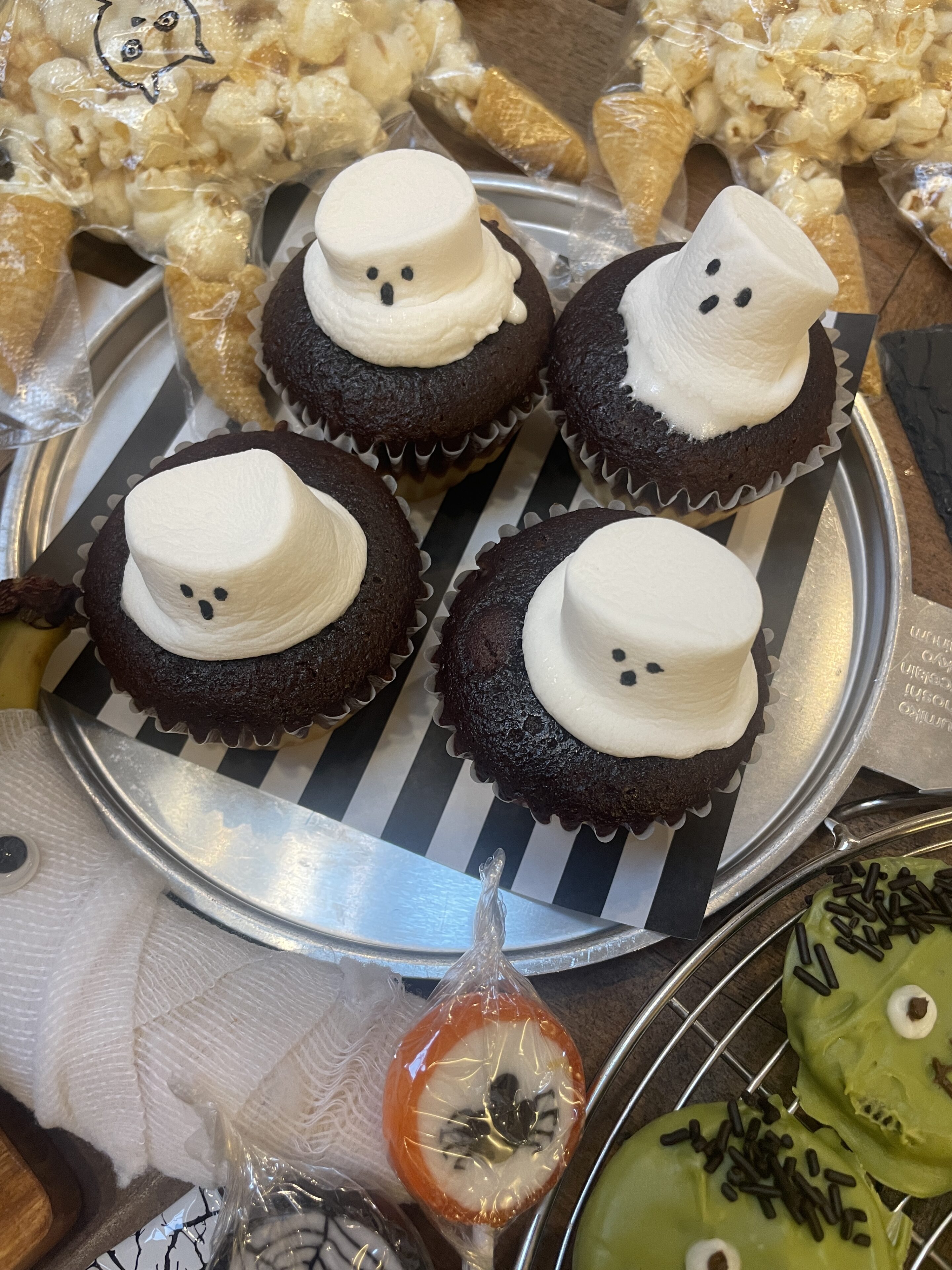 あとは市販のチョコカップケーキにマシュマロを乗せて少し温めて溶かします。顔をチョコペンで書くだけで完成です。