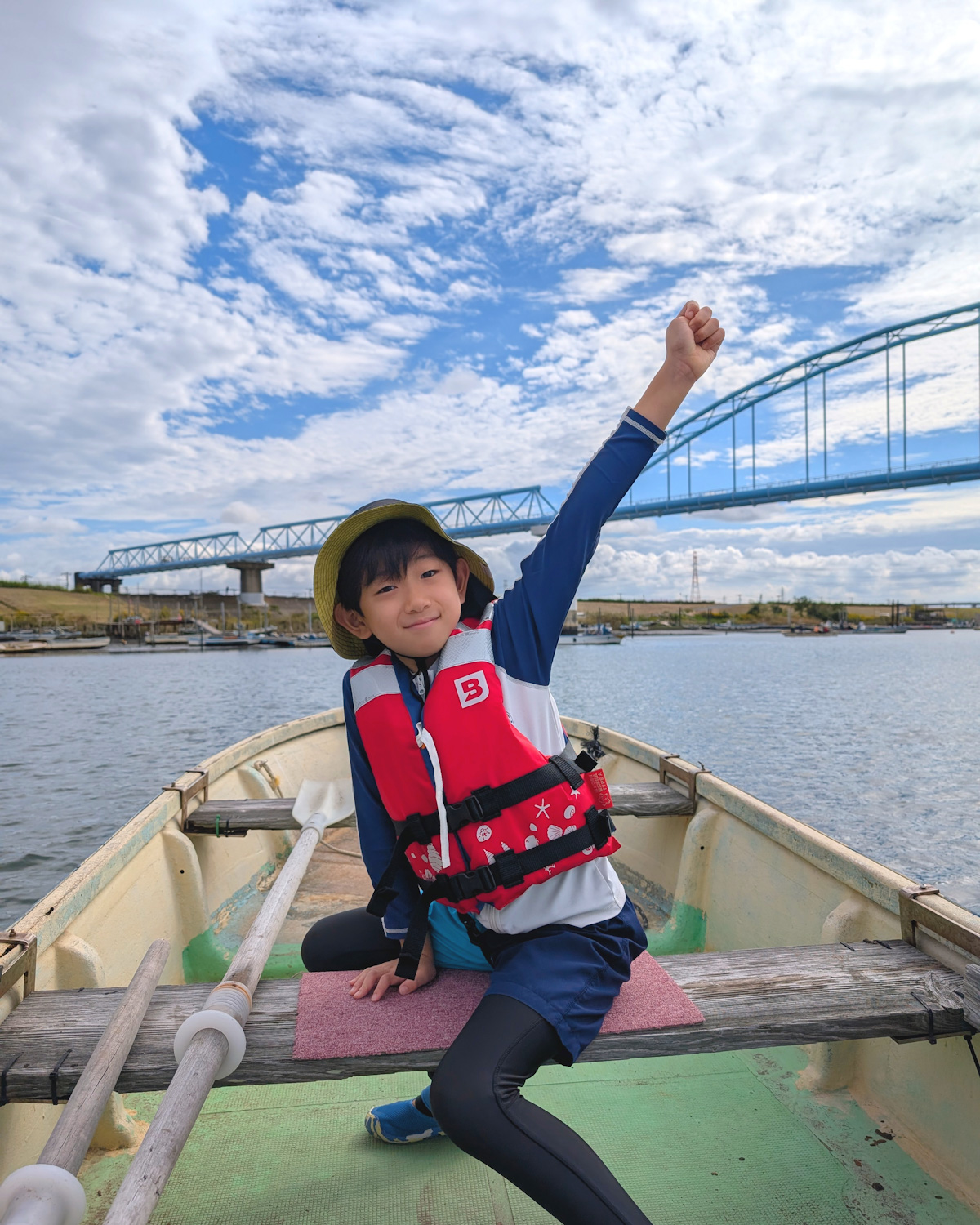 今回、ボート屋さんでボートを出してもらいました。初めてのボート釣りなのもあり、低学年の子ども連れなので沖には出ず、近場の川の真ん中辺りに連れて行ってもらい、イカリを降ろしていざスタート!