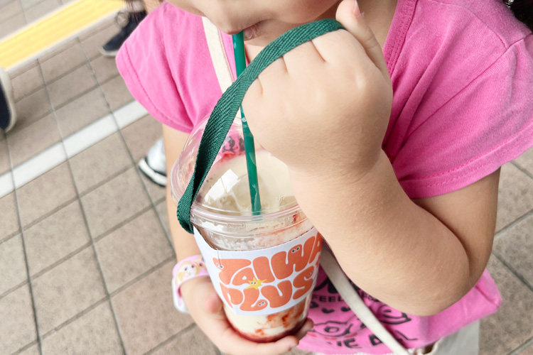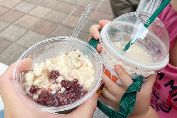 ドーナツの次は、いちごソースと豆乳の組み合わせが飲みやすい「豆乳いちごミルク」に子どもが夢中。一方、私は豆乳を使用した台湾デザートの豆花(トウファ)を実食しました。