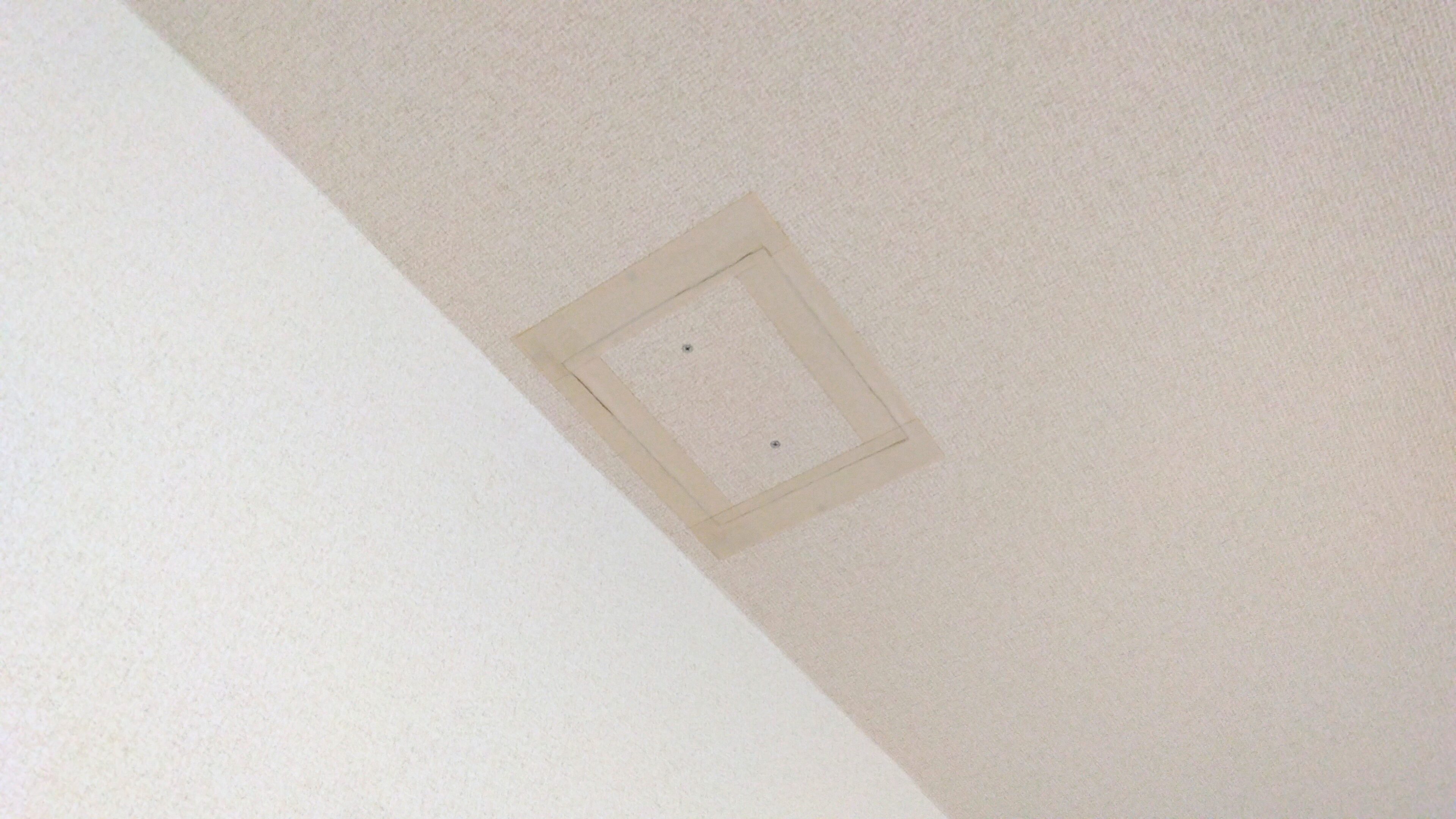 A4サイズ程度の大きさで、何の跡かは不明です。ただ人は通れないサイズですし、我が家は最上階ではないので上からの侵入は不可能。もちろん、現実的なツッコミは控えていますよ!キラキラした目で天井を見上げる姿を見ると、何も言えなくなります。
