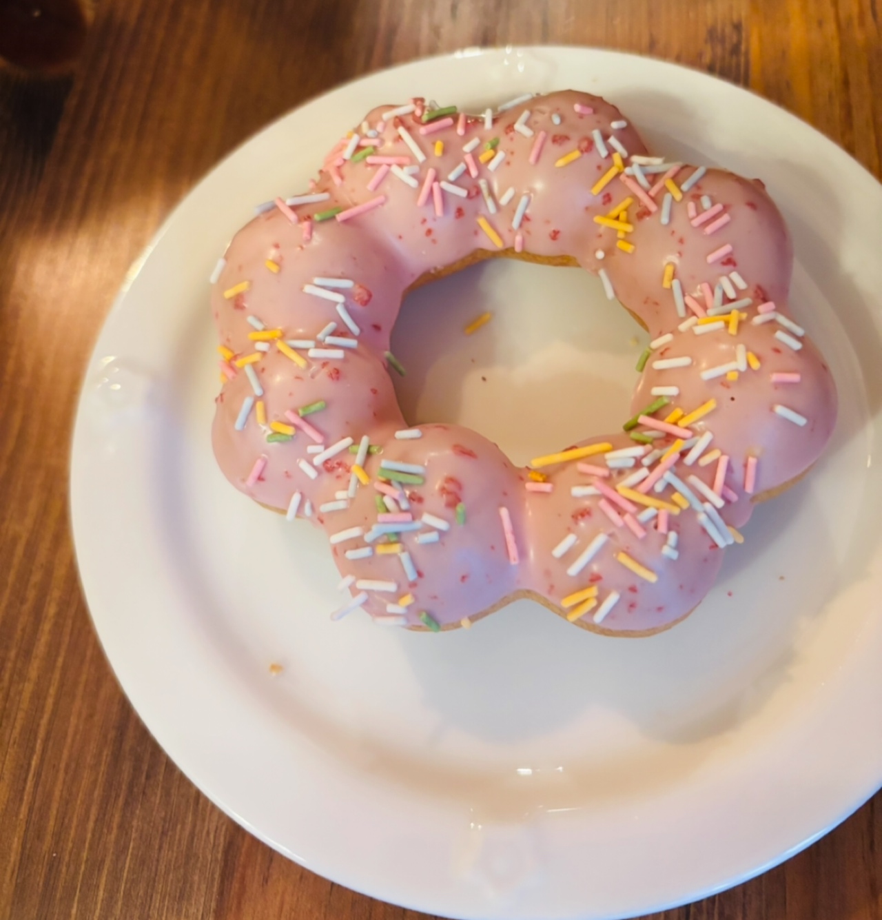 きのこの傘の部分には、しっとり食感のケーキドーナツ生地に、ホワイトチョコとストロベリーチョコがコーティングされています。さらに、ストロベリーシュガーがトッピングされています。