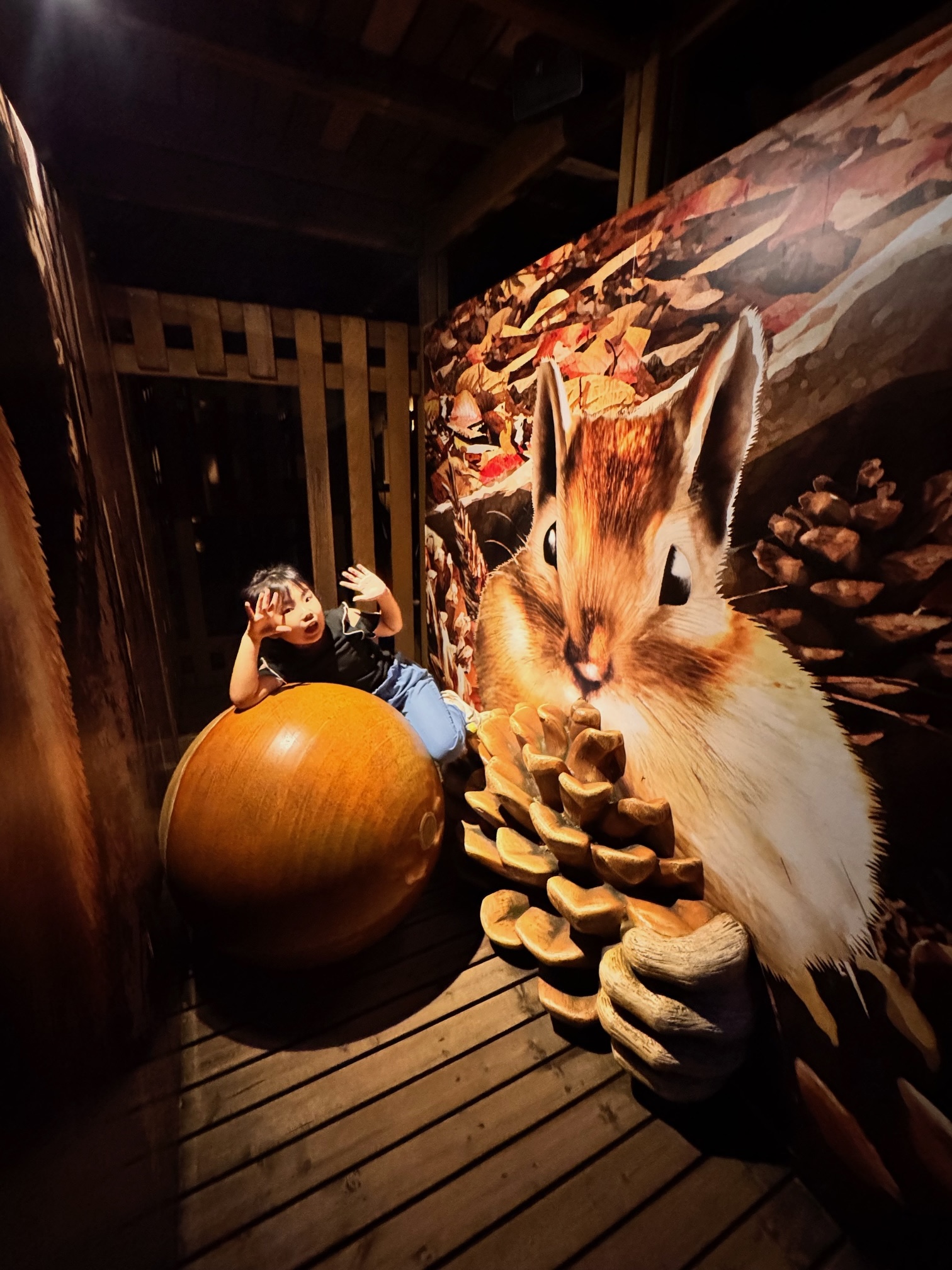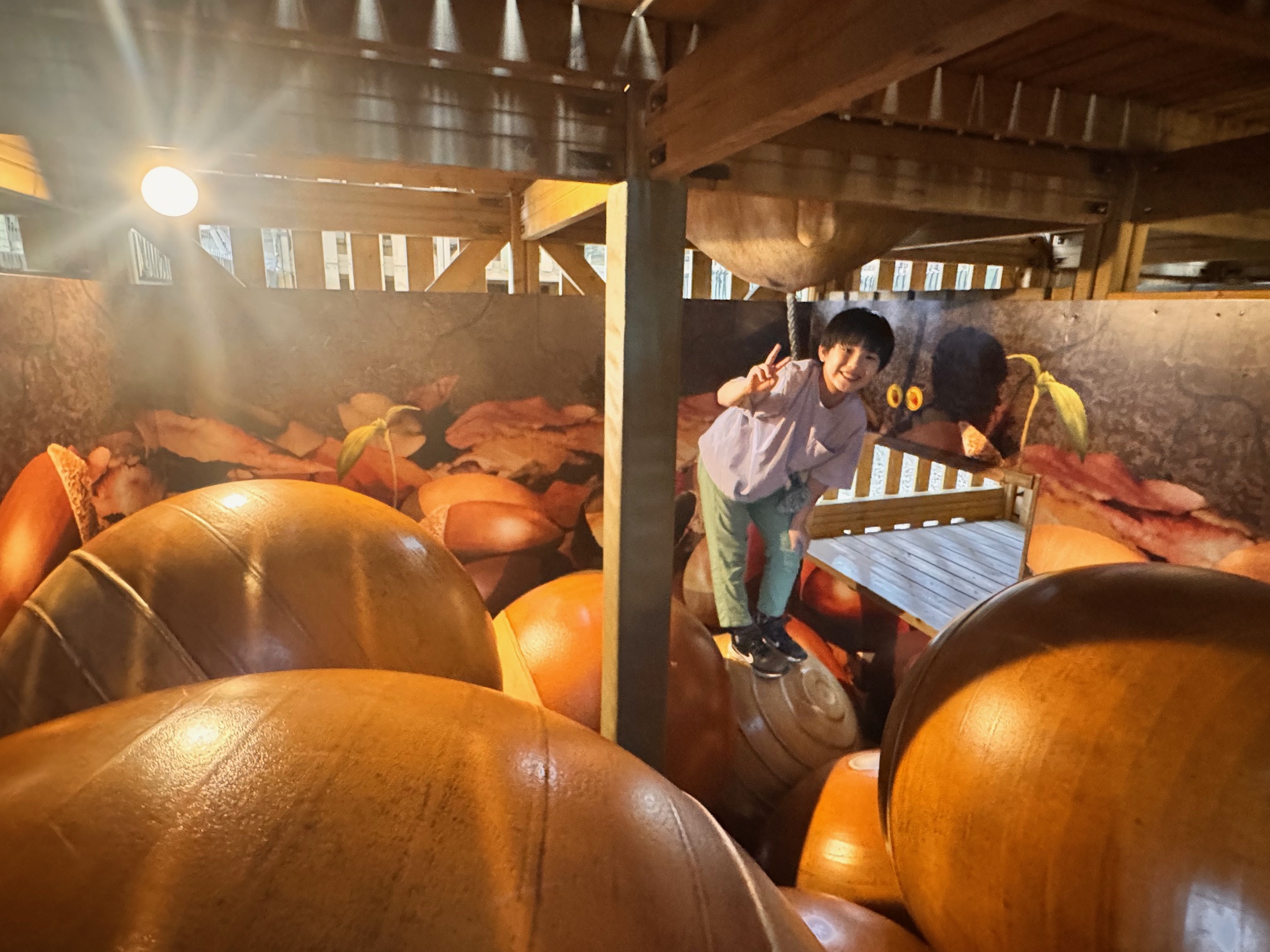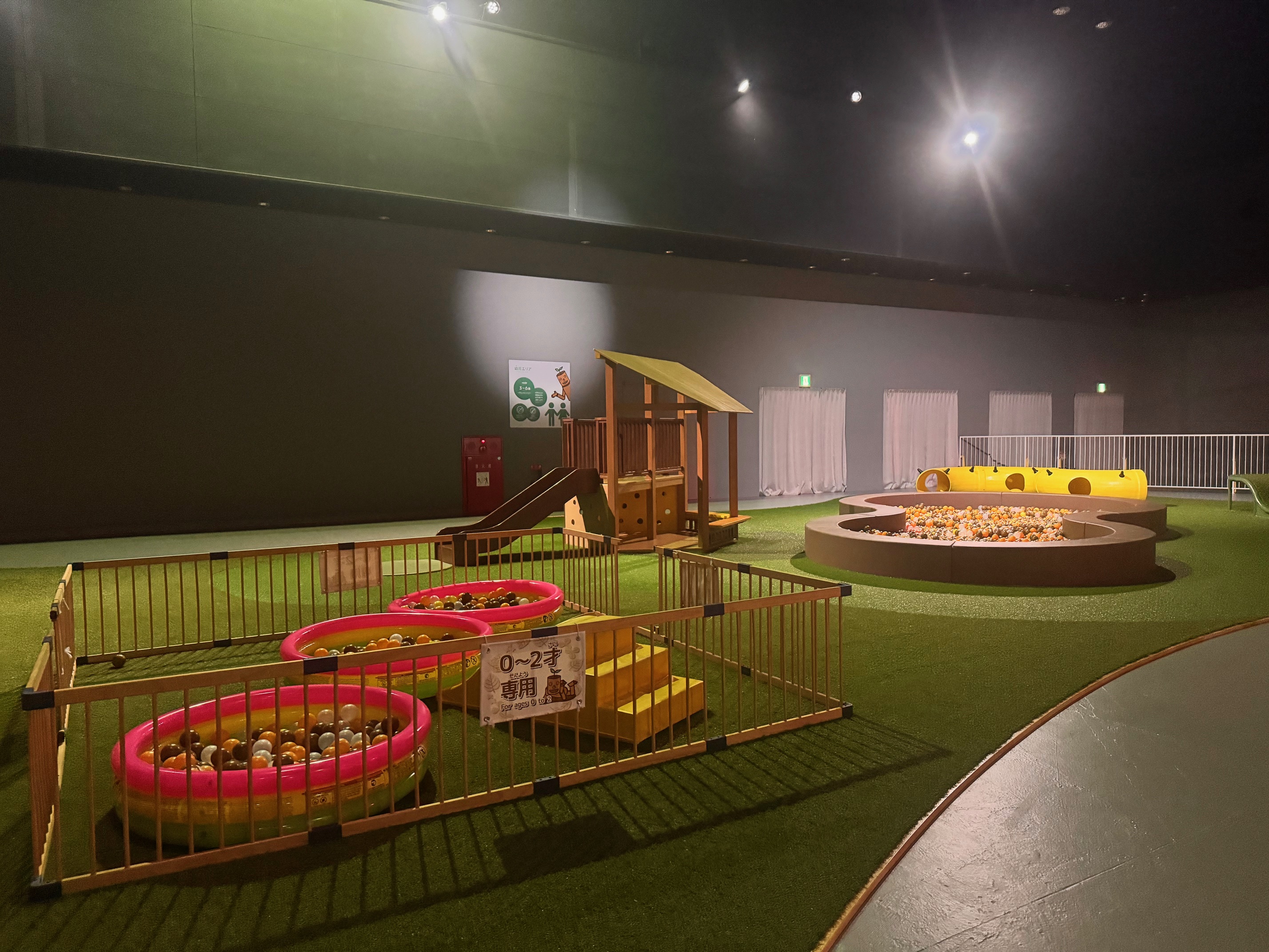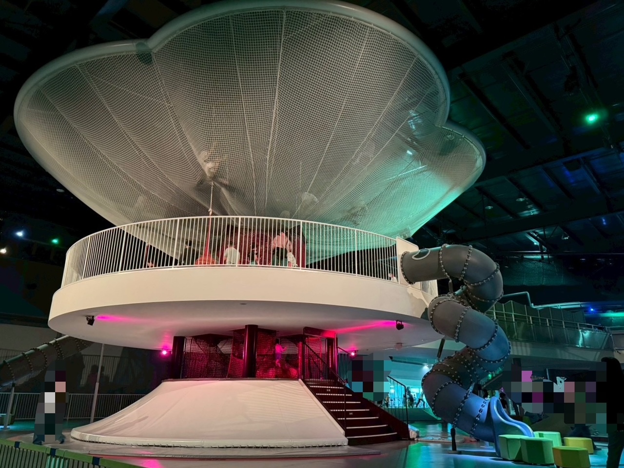 森の生きものたちが隠れるすみかをテーマにした、屋内の巨大ネットアスレチック。光と音の多彩な空間演出で森の1年を表現しています。巨大な2つのネットには森を感じる31の仕掛けがあり、跳んだり、寝転んだり、すべったり、自由な遊び方ができます。こちらのアスレチックは3歳から遊べますが、0歳児も遊べるキッズコーナーや大人もくつろげそうなレストエリアもあり、休憩しながら見守れるので助かりました。待ち時間は40分、所要時間も40分でした。